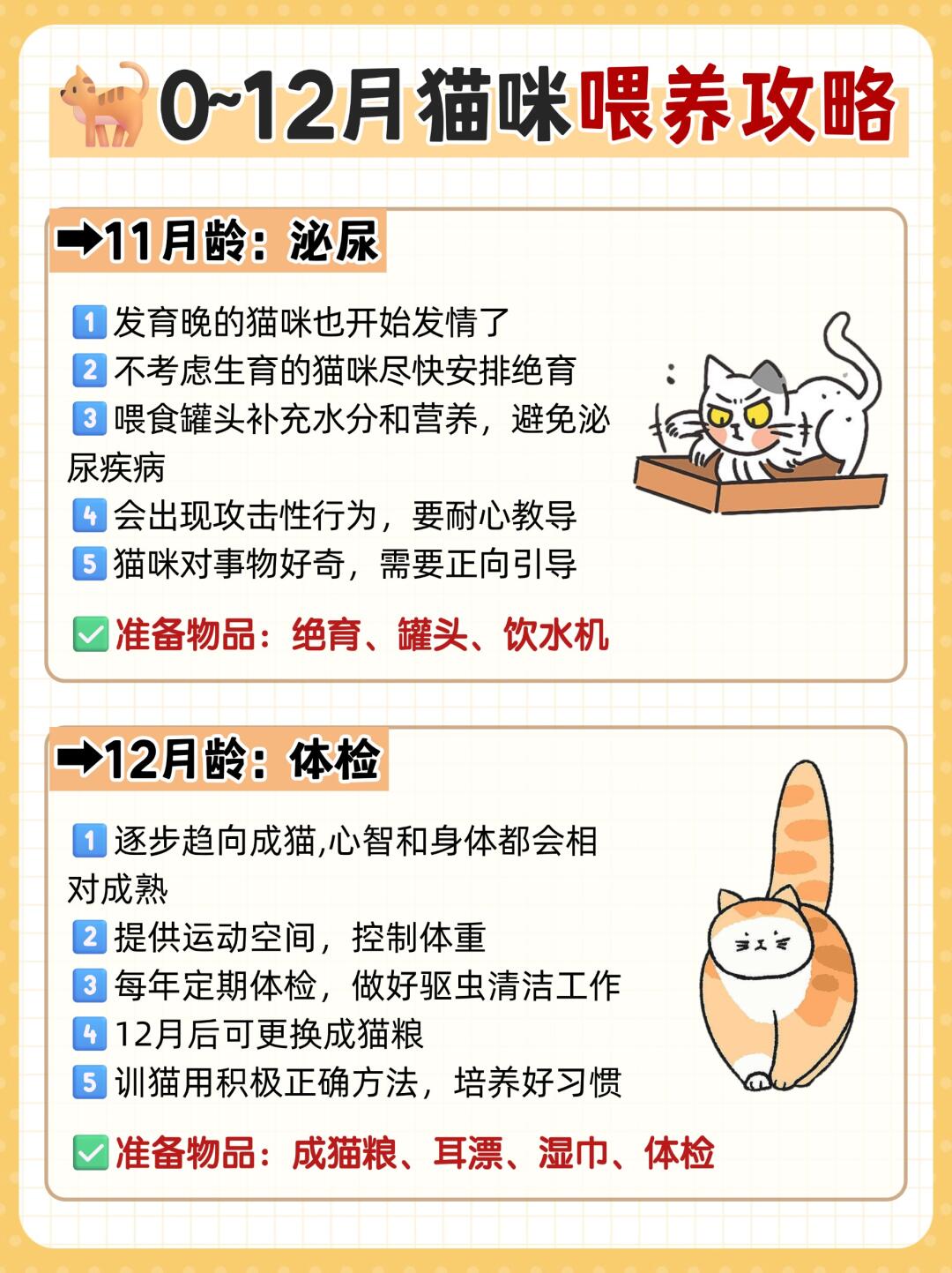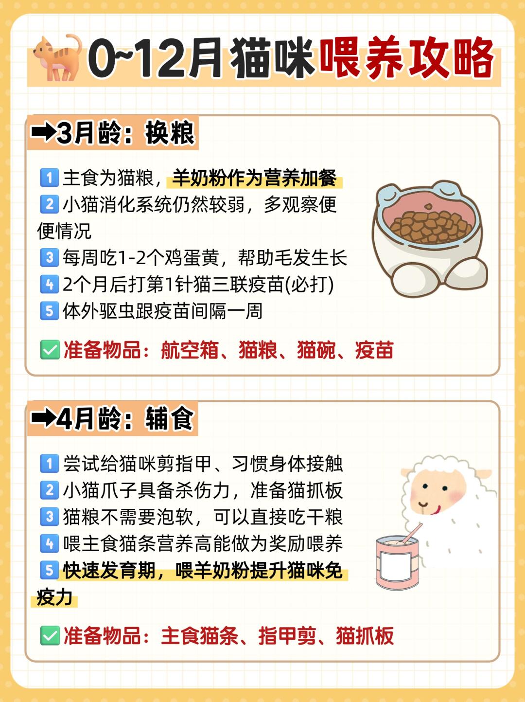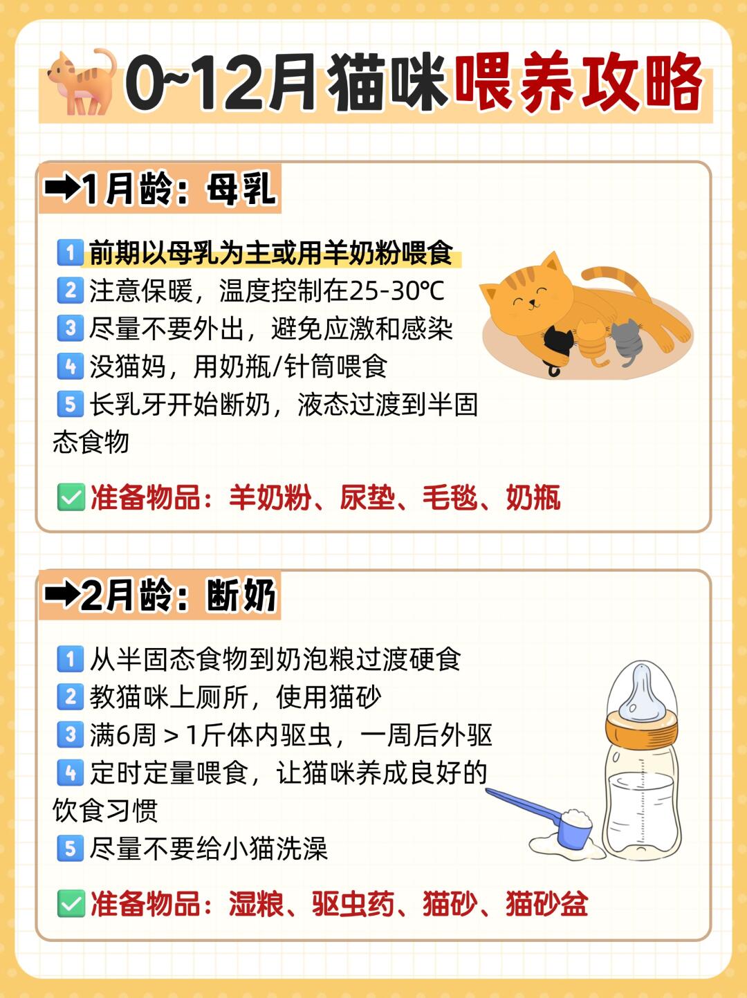 🙆♀很多新手铲屎官接到小猫回家,不知道怎么喂养。✅码住这一篇幼猫0-12月成长阶段养护指南,轻松喂养小奶猫~