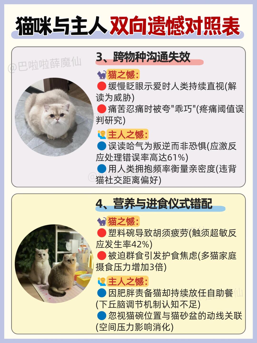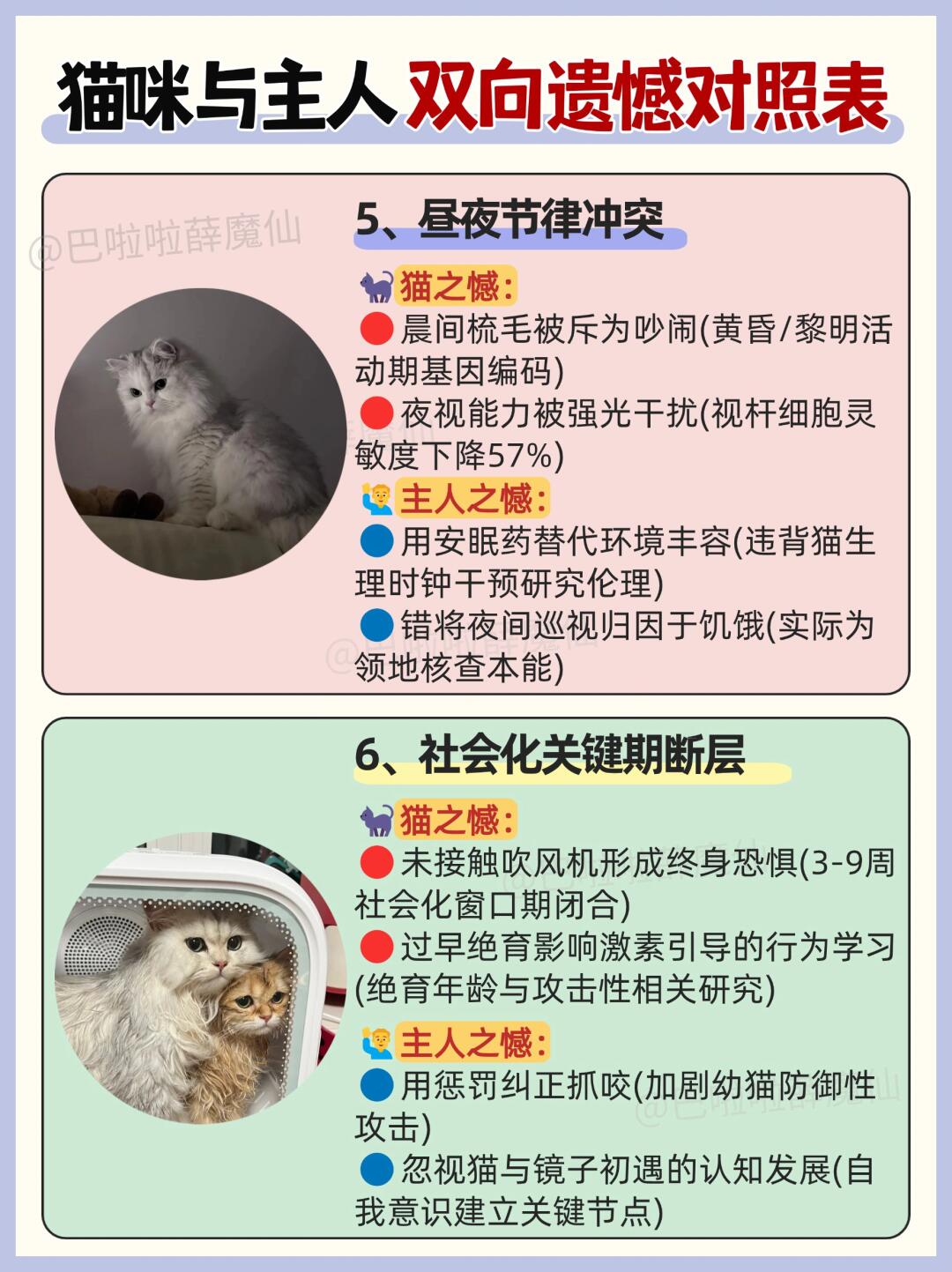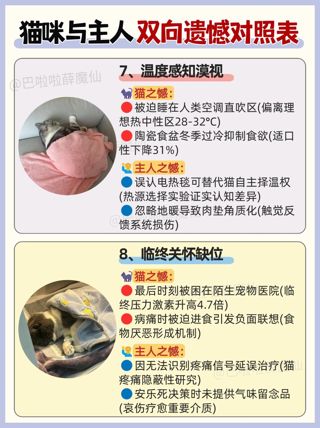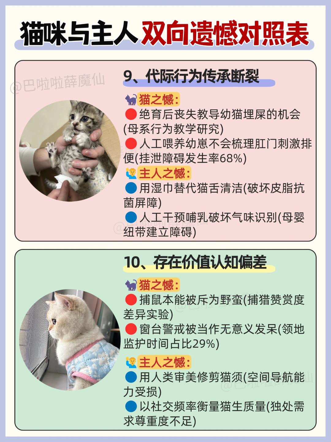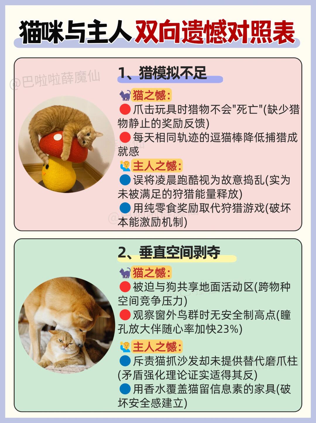 😿小猫的十件心事,那些没说出口的喵生遗憾,铲屎官们一定要知道!一定要尽量满足它们呀~ 1、猎模拟不足 2、垂直空间剥夺 3、跨物种沟通失效 4、营养与进食仪式错配 5、昼夜节律冲突 6、社会化关键期断层 7、温度感知漠视 8、临终关怀缺位 9、代际行为传承断裂 10、存在价值认知偏差
