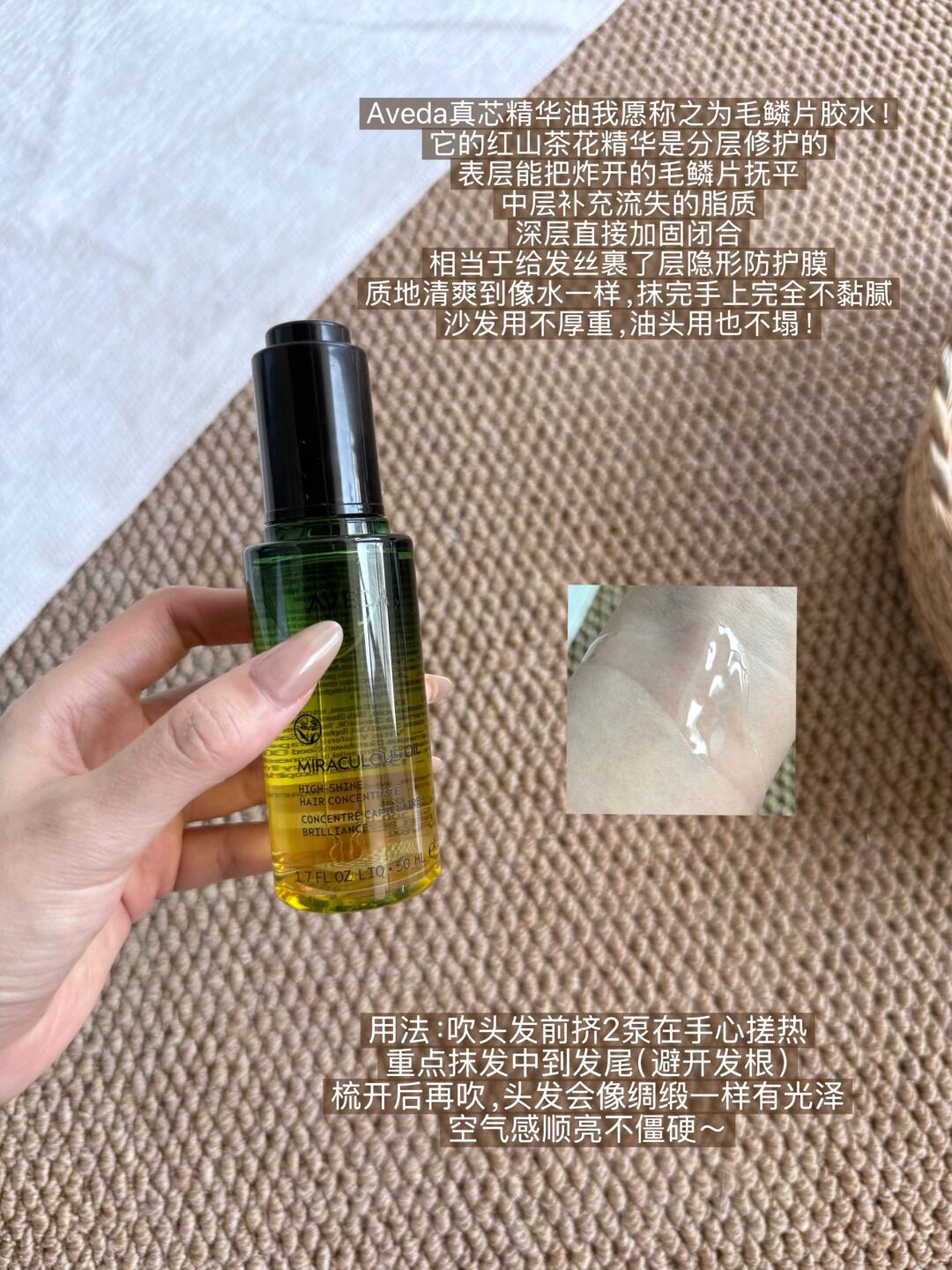沙发变绸缎发的秘诀除了找到合适自己的洗发水和发膜之外,护发精油至关重要!沙发的毛鳞片长期处于张开状态,一缺水就炸毛,这时候必须用对精油,真的能让护发效率翻倍!Aveda真芯精华油我愿称之为毛鳞片胶水!为啥这么说?它真的把优点焊死了 ——比普通精油更轻盈、吸收也更快,修护力却比一般精华更猛、见效更快,所以才叫精华油啊!它里面的的红山茶花精华可以渗透进10层毛鳞片分层进行修护:表层能把炸开的毛鳞片抚平,中层补充流失的脂质,深层直接加固闭合,相当于给发丝裹了层隐形防护膜;加上5倍精油微酵科技,质地清爽到像水一样,抹完手上完全不黏腻,沙发用不厚重,油头用也不塌。自然光下,发丝透着亮到发梢的通透感,是那种刚做完护理的顺,发丝亮亮的贼轻盈~而且那味道太绝了!是那种很有质感的薰衣草混合依兰香,不是廉价香精味,抹完头发出门,风一吹全是淡淡的高级香,走在路上都自带贵气 Buff,千金感直接拉满!