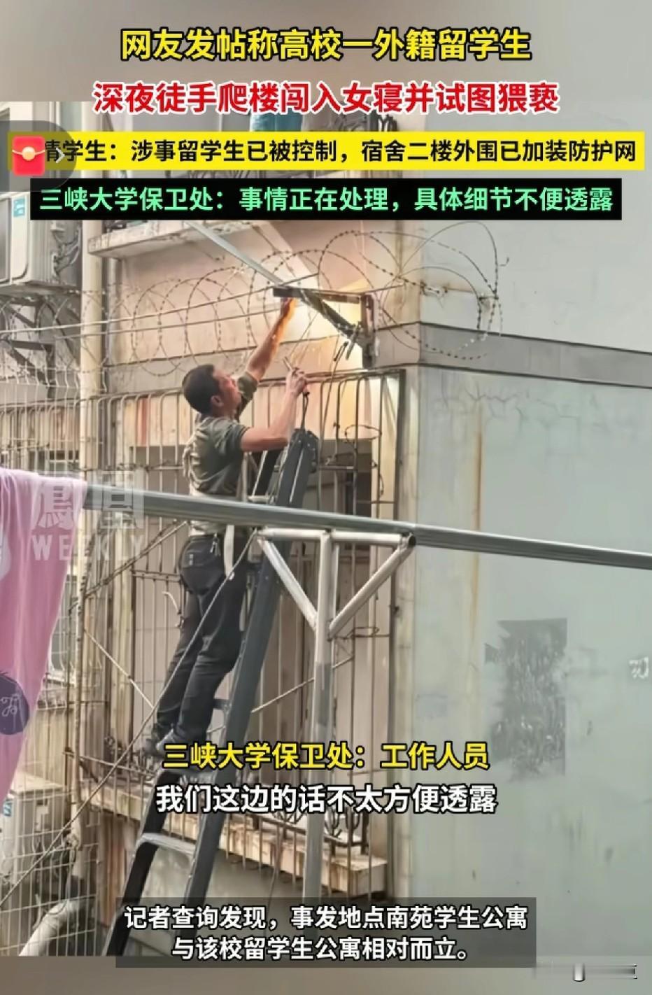 敢在中国欺负中国人, 胆子也太大了! 三峡大学一名黑人留学居然半夜徒手爬女生宿舍楼,意图不轨。受害女生拼死反抗大声呼救黑人才被吓跑了。最后管宿阿姨当场报警,这事看得人火冒三丈! 更气人的是,有学生反应这不是头一回。女生宿舍内衣总是频繁丢失,看来女生宿舍的安全早就有隐患了,想想都让人后怕! 据说三峡大学本科只有2.5万人左右,但留学生人数高达1850多人。我都奇怪了,这也不是什么有名的学校。为什么留学生这么多。 留学生多没问题,但不能搞“双重标准”吧?留学生公寓有电子围栏和人脸识别,女生宿舍却连防爬设施都没有,巡逻还能出空档。重点保护的不该是女生吗? 现在黑人被开除了,学校给女生宿舍加装了防护网,但学校这么多留学生,如果不完善制度,加强巡逻,有可能下次还出事。 对这种行为恶劣的黑人应该驱逐出境。 大家对此有什么看法呢?