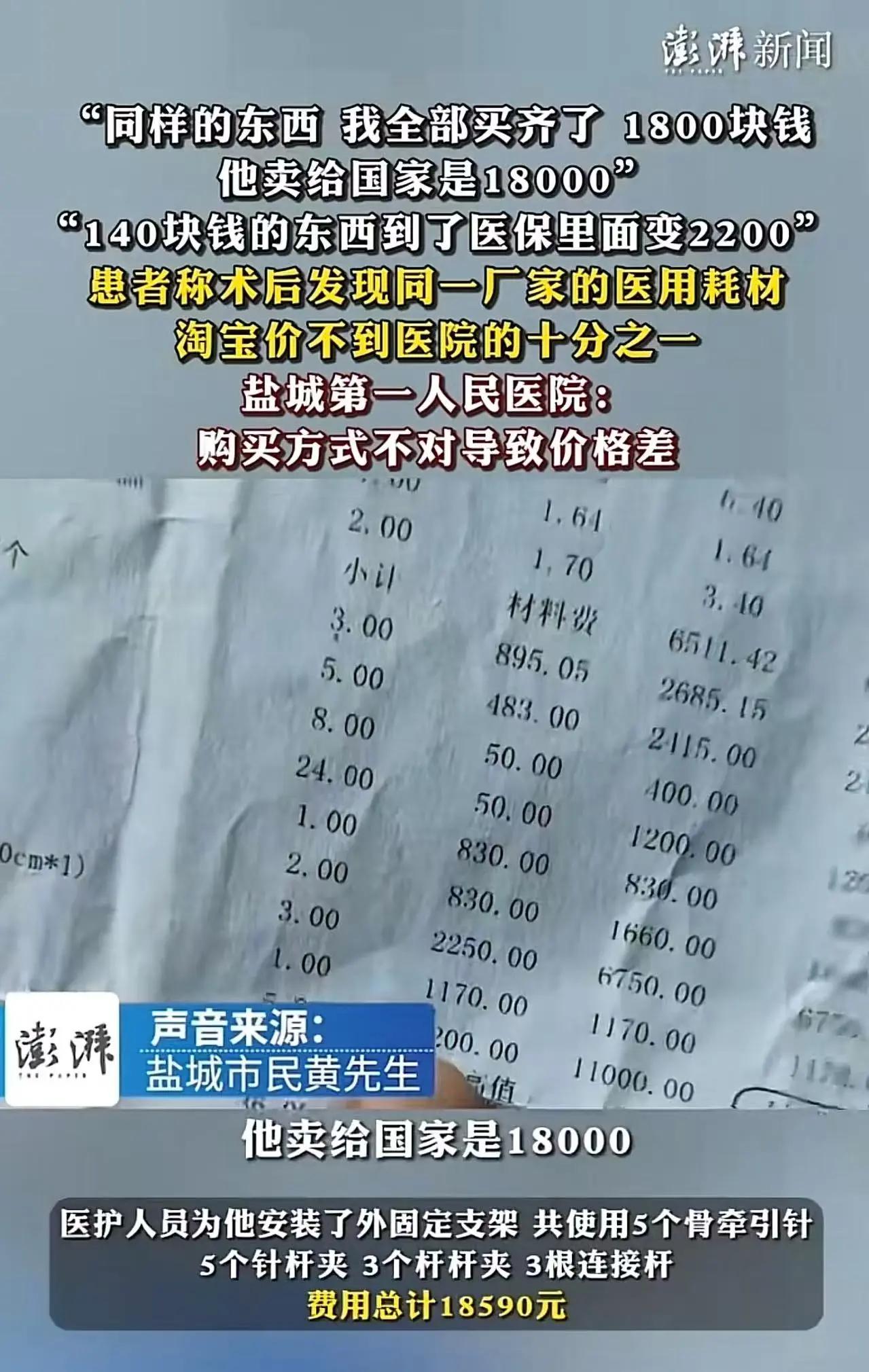 骨折花8万,网上搜耗材发现卖1800?这波“医院消费刺客”我服了! 家人们,先问你们个灵魂问题:你有没有过“花钱时像土豪,查完价像冤种”的崩溃瞬间? 我闺蜜上次拔牙,医生说“小问题,两百搞定”,结果麻药一上、钳子一拿,最后账单出来:“拔牙200,消炎棉50,止痛药80,挂号30”,合着拔颗牙花了360,她回家翻外卖软件,发现同款止痛药9.9包邮,当场把缴费单揉成了团。 但要说“冤种天花板”,还得看江苏盐城的黄先生——这人前段时间出了车祸,腿骨折了,在医院躺了几天,手术做完拿到账单,眼睛差点没瞪出来:总费用近8万! 黄先生拿着账单跟看天书似的,逐行扒拉:住院费、手术费、药费……最后目光停在一串“骨科耗材”上:外固定支架、5个骨牵引针、5个针杆夹、3根连接杆,光这堆“小零件”就收了18590元。 他盯着“18590”这串数字,越看越犯嘀咕:这玩意儿是用金子做的?还是镶了钻?咱普通人买根不锈钢晾衣杆才20块,这几根杆儿加几个夹子,怎么就敢卖近两万? 于是黄先生开启了“网购达人模式”——打开购物软件,输上耗材的品牌型号,手指头一点搜索,结果出来的瞬间,他感觉自己的腿又疼了一次:网上同款,一模一样的东西,1800块就能拿下! 18590和1800,差了整整10倍还多!黄先生当时的心情,我猜跟你发现“直播间99元抢的卫衣,隔天看拼多多39.9还包邮”一样:不是心疼钱,是心疼自己这“大冤种”体质啊! 这事一曝光,网友们瞬间炸了锅,评论区里全是“感同身受”的吐槽: 有人说“上次切个阑尾,住院三天花了5000,回家搜手术用的止血钳,淘宝15块一把,我当时就想,早知道自己买把钳子对着镜子切了”; 还有人说“我妈去年做白内障手术,单一个人工晶体就收了8000,后来我在医疗器械店问,同款晶体批发价才1200,合着我们花的钱,一半是给医院当‘跑腿费’了?”; 更有人戳中痛点:“最气的是啥?你以为有医保能报销,结果报销完一算,自己掏的钱还是跟没报销差不多——合着医保报的是‘虚高的水分’,咱掏的还是‘实打实地冤枉钱’?” 其实咱普通人看病,不怕花钱,怕的是“花得不明不白”。就像黄先生这事儿,不是说医院不能赚钱,毕竟医生做手术、护士照顾病人都辛苦,可这耗材从1800涨到18590,中间的差价到底去哪了?是层层代理加价了?还是医院采购流程有猫腻?这些咱都不知道。 咱就想搞明白:为啥网上能买到1800的东西,到了医院就得翻10倍?难道“医院专供”这四个字,比黄金还值钱? 还有更扎心的:现在不少人看病,都得先当回“侦探”——手术前先搜搜耗材价,拿药前先查查医保报销比例,就怕一不小心,就成了“待宰的羔羊”。有个网友说得特实在:“我上次去看牙,医生说要装个‘进口牙冠’,报价6000,我当场说‘我先回家想想’,转头就去医疗器械城问,同款牙冠2800,最后找了个靠谱的诊所装上,省了一半多——不是咱抠,是咱的钱也不是大风刮来的啊!” 黄先生的遭遇,其实是很多人的缩影:谁还没在医院遇到过“消费刺客”呢?可能是一支“进口药膏”,可能是一个“一次性耗材”,明明网上查着很便宜,到了医院就身价暴涨。咱不是反对医疗收费,是希望收费能透明点——至少让咱知道,这钱花在了哪,为啥这么贵。江苏 医院