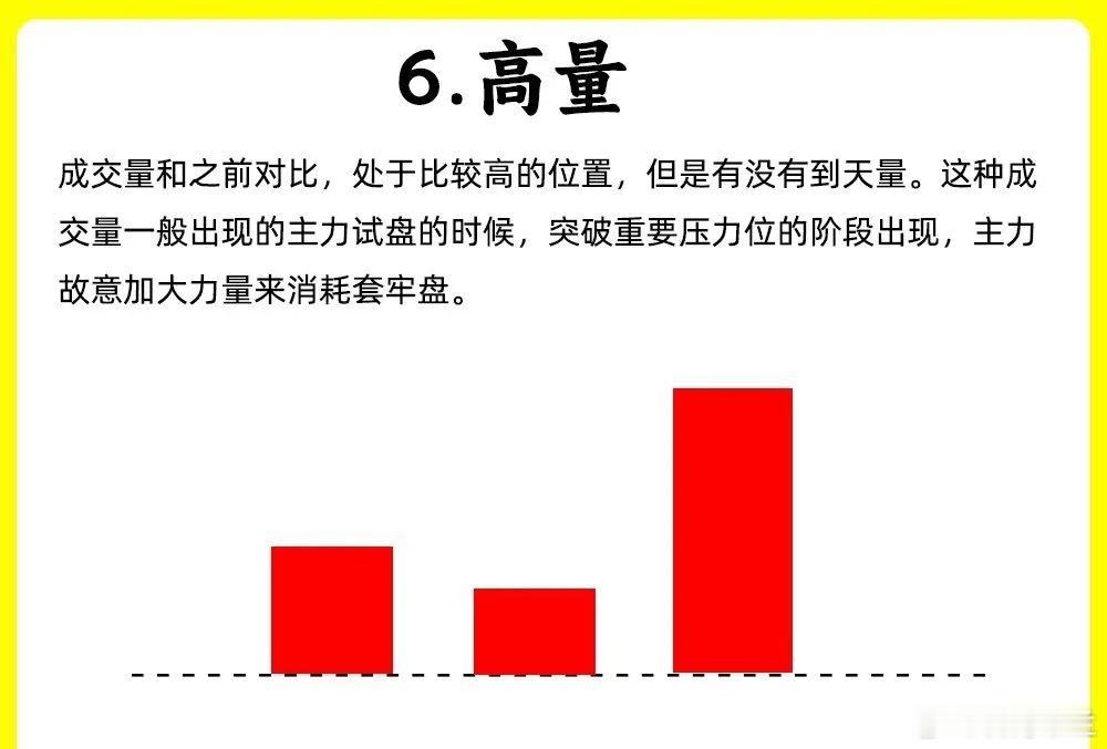 当天的成交量和之前对比,处于比较高的位置,但是有没有到天量。这种成交量一般出现的主力试盘的时候,突破重要压力位的阶段出现,主力故意加大力量来消耗套牢盘。高量说明此时交易活跃度很高,像我们常见的形态就高量不破,放量过左峰等等。
