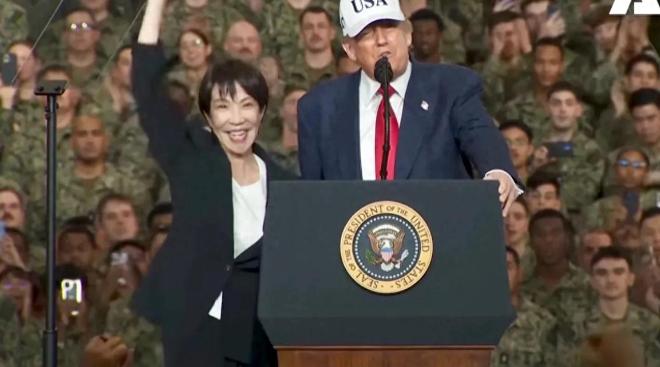 刚当首相才7天,高市早苗就整出了大动静,昨天她跟着美国总统特朗普直奔驻日美军横须贺基地,一起登上了“乔治・华盛顿”号核动力航母,这波操作直接把全网热度拉满。 更绝的是,高市还蹭上了特朗普的“海军陆战队一号”,要知道这可是特朗普的“私人座驾”,不少外国领导人都没这待遇,高市这波贴贴直接把亲美态度摆到明面上。 而登上航母后,特朗普对着几千名美军官兵声称“高市是赢家”,再看高市的表现,全程笑得合不拢嘴,视线几乎没从特朗普身上挪开。 更别提她发言时激动得蹦蹦跳跳挥手,那股子热情劲儿简直藏不住。 可这一幕传到日本网上,直接被网友骂惨了:“物价涨得飞起不管,倒先忙着讨好美国,太丢国家的脸了!” 还有人说:“这哪里是首相会晤,分明是粉丝见偶像,也太没骨气了!” 虽然也有个别支持高市的声音,但分分钟就被吐槽声淹没。 然而这趟行程高市也没白跑,当场宣布要把国防开支“提速”原本计划两年后才达到的军费目标,现在直接提前推进。 说白了就是互相利用,高市刚上任根基不稳,想靠美国撑腰站稳脚跟,而特朗普也需要日本在亚太帮忙,双方一拍即合。 但如今一边是美日高调秀同盟送武器,一边是日本民众骂声一片,高市这波操作到底是为了国家利益,还是把日本绑上美国战车?