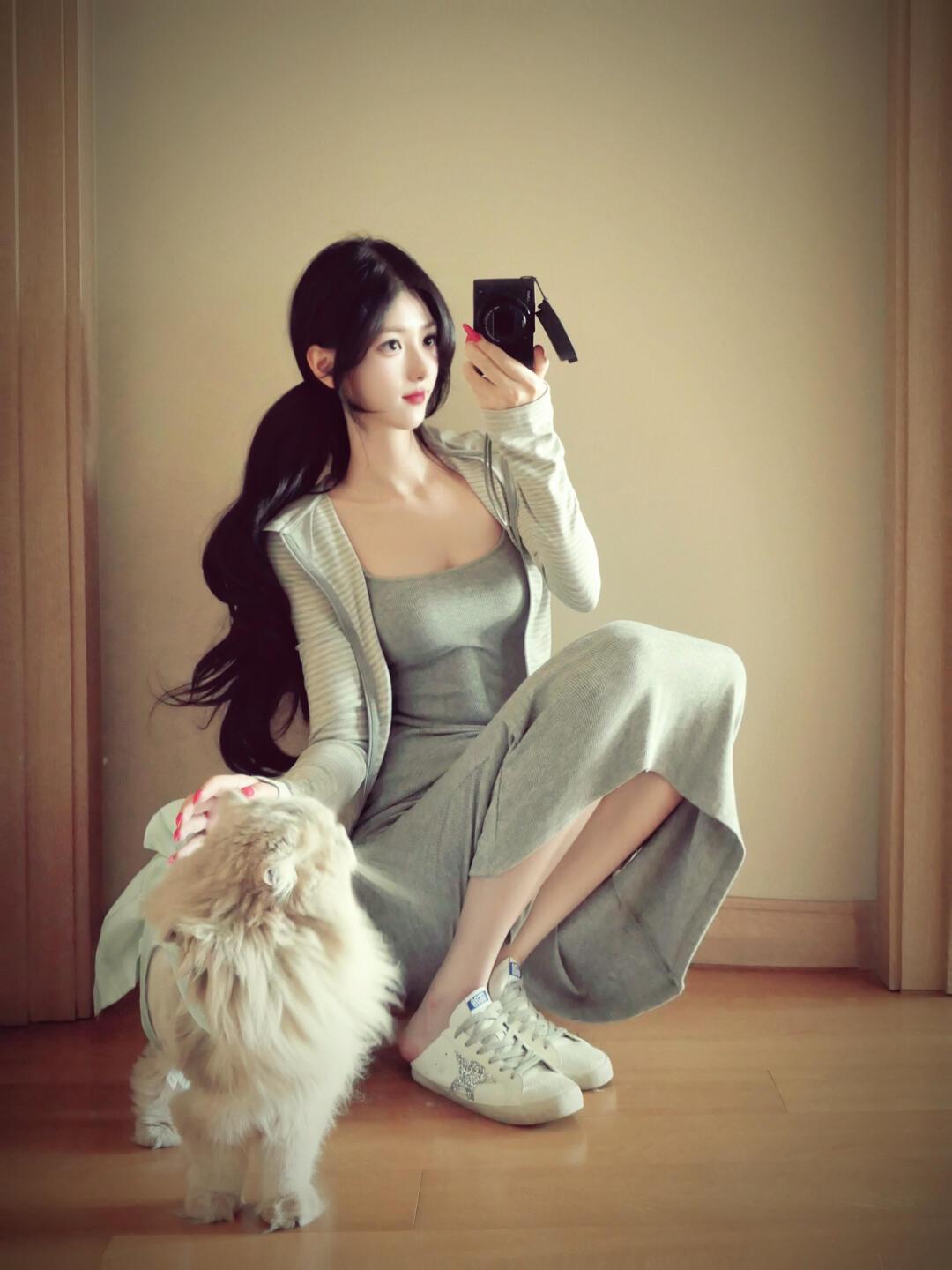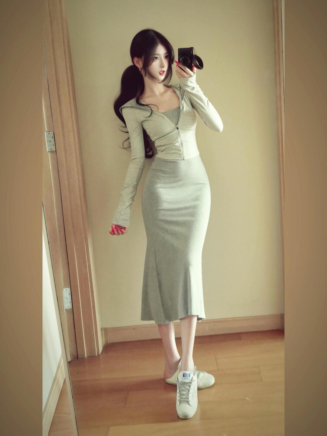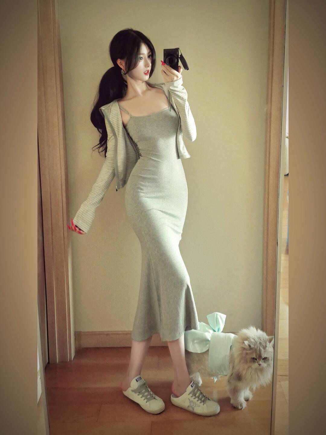 晒图笔记大赛 优雅自拍,米色连衣裙搭配高跟鞋,镜中自拍的时尚瞬间