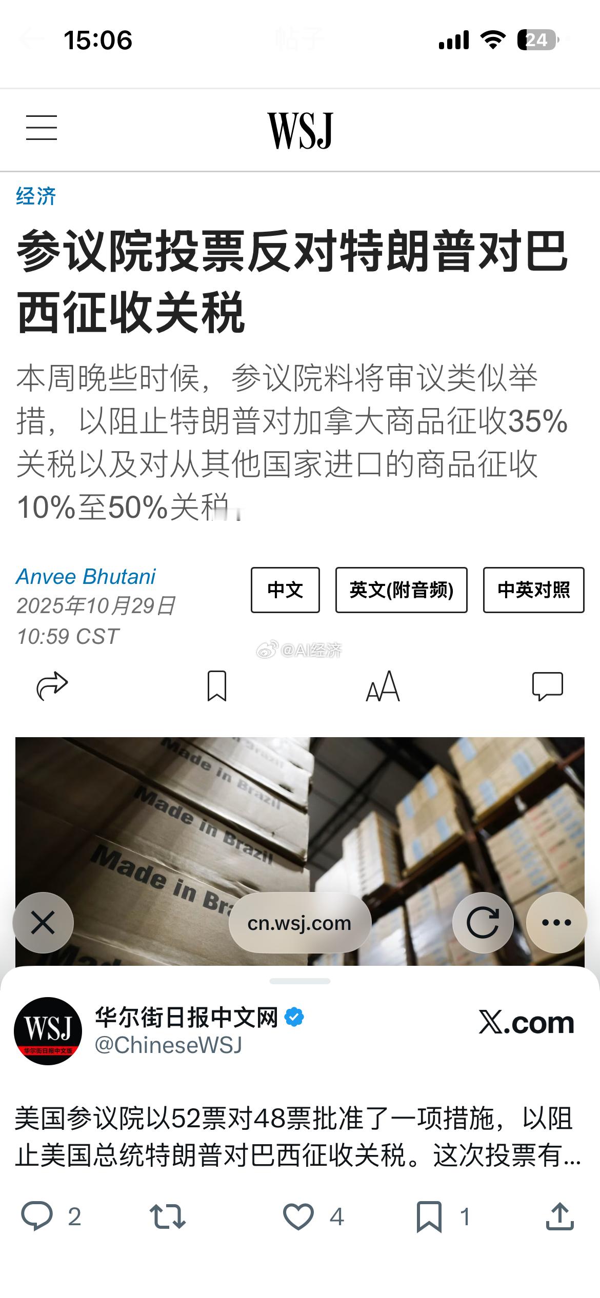 参议院投票反对特朗普对巴西征收关税