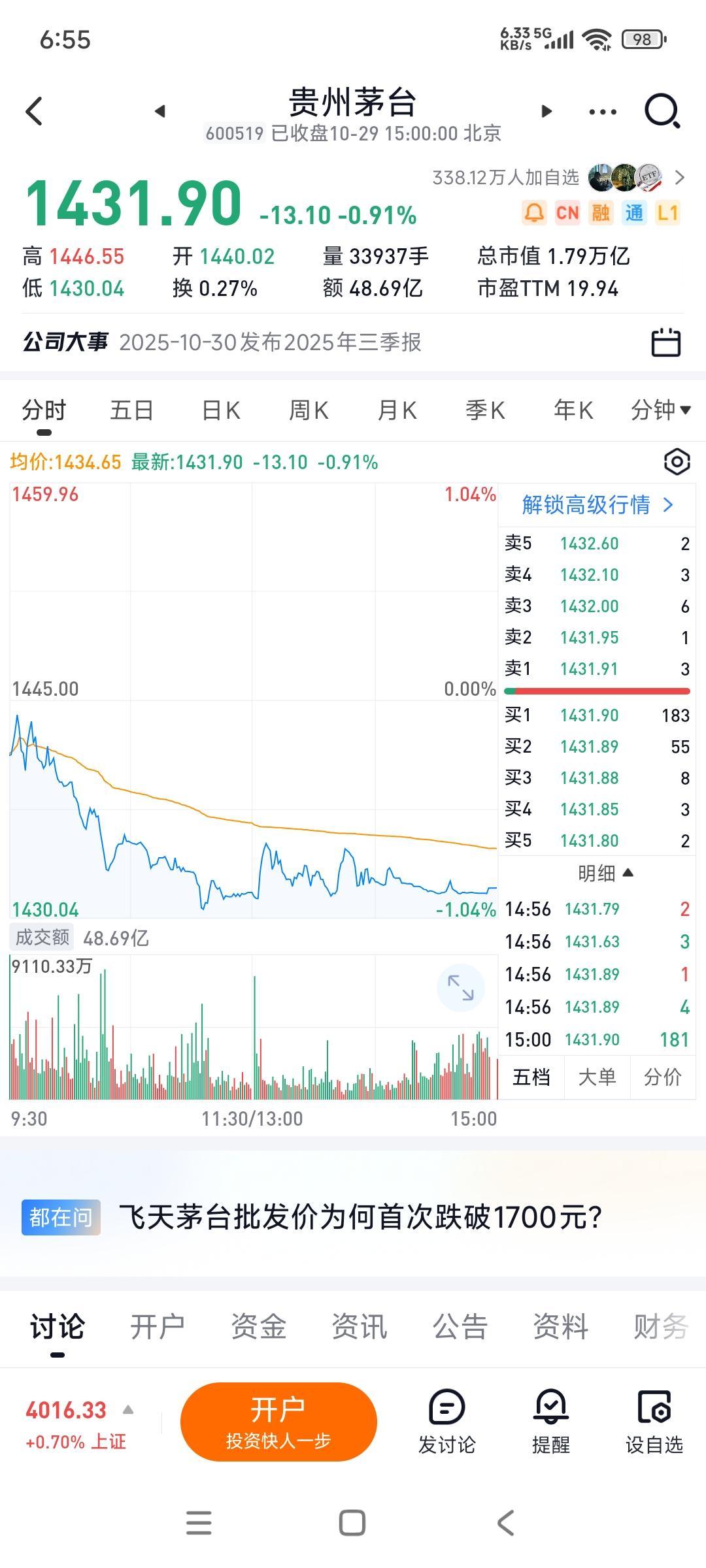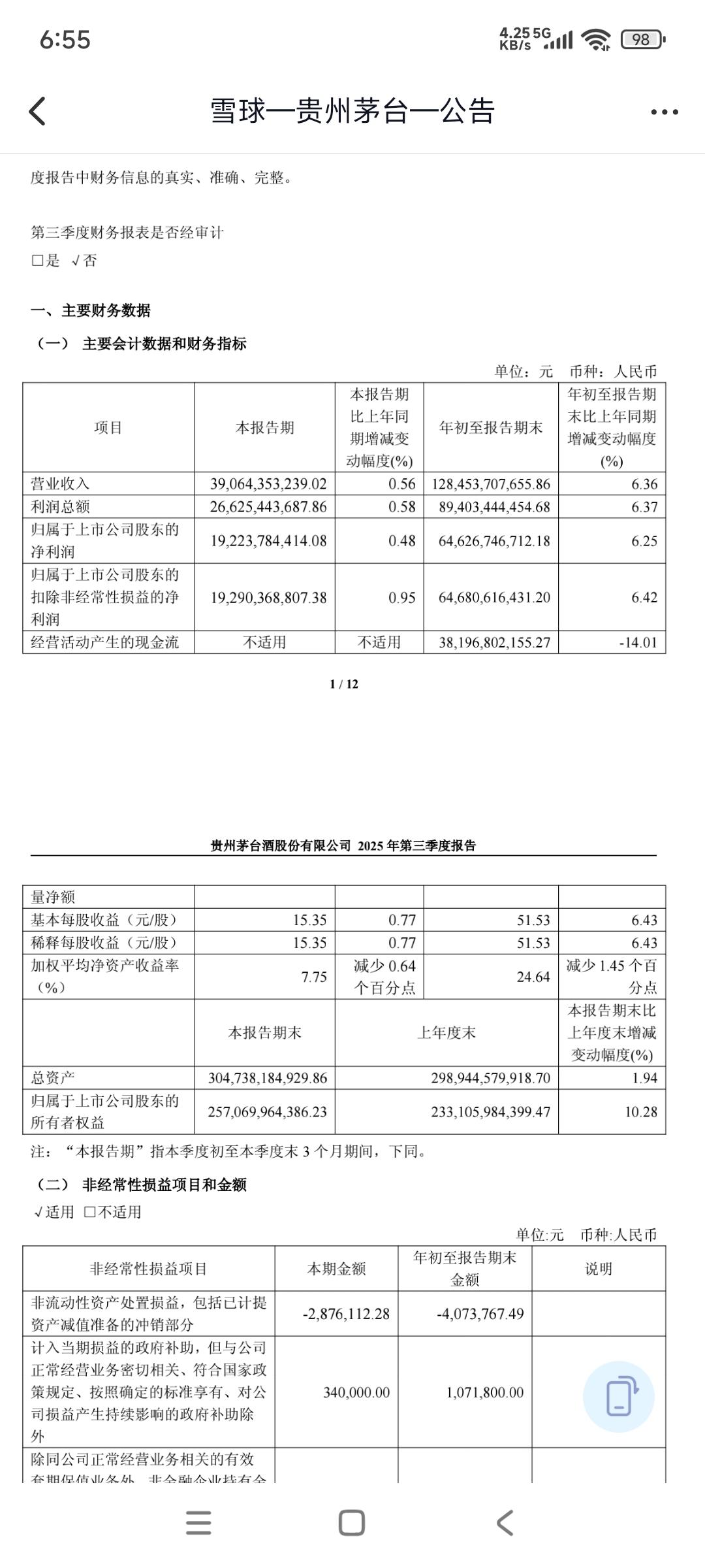 贵州茅台第三季度的营收与净利润几乎都没增长,其实,这就是趋势,能保持到现在,已经不容易了... 当前,飞天茅台的批价已经跌到1600元左右,仅仅溢价100多块,而其他所有产品都已跌破发行价,这也是导致第三季度营收不涨的原因... 而当飞天茅台的批价继续下行,失去溢价空间的飞天茅台,估计再也没有人愿意购买,愿意囤货了,到那时,营收和净利润可能出现负增长... 导致如此情形,有他们自己无限扩产能的一个因素...