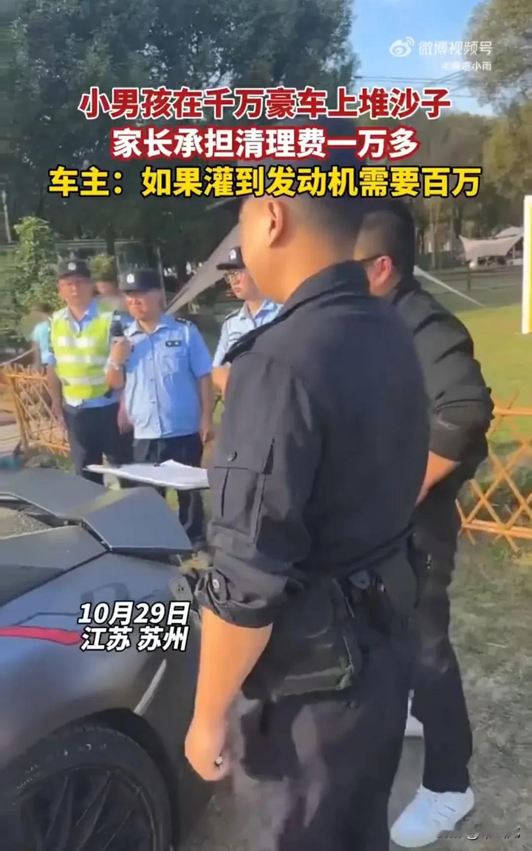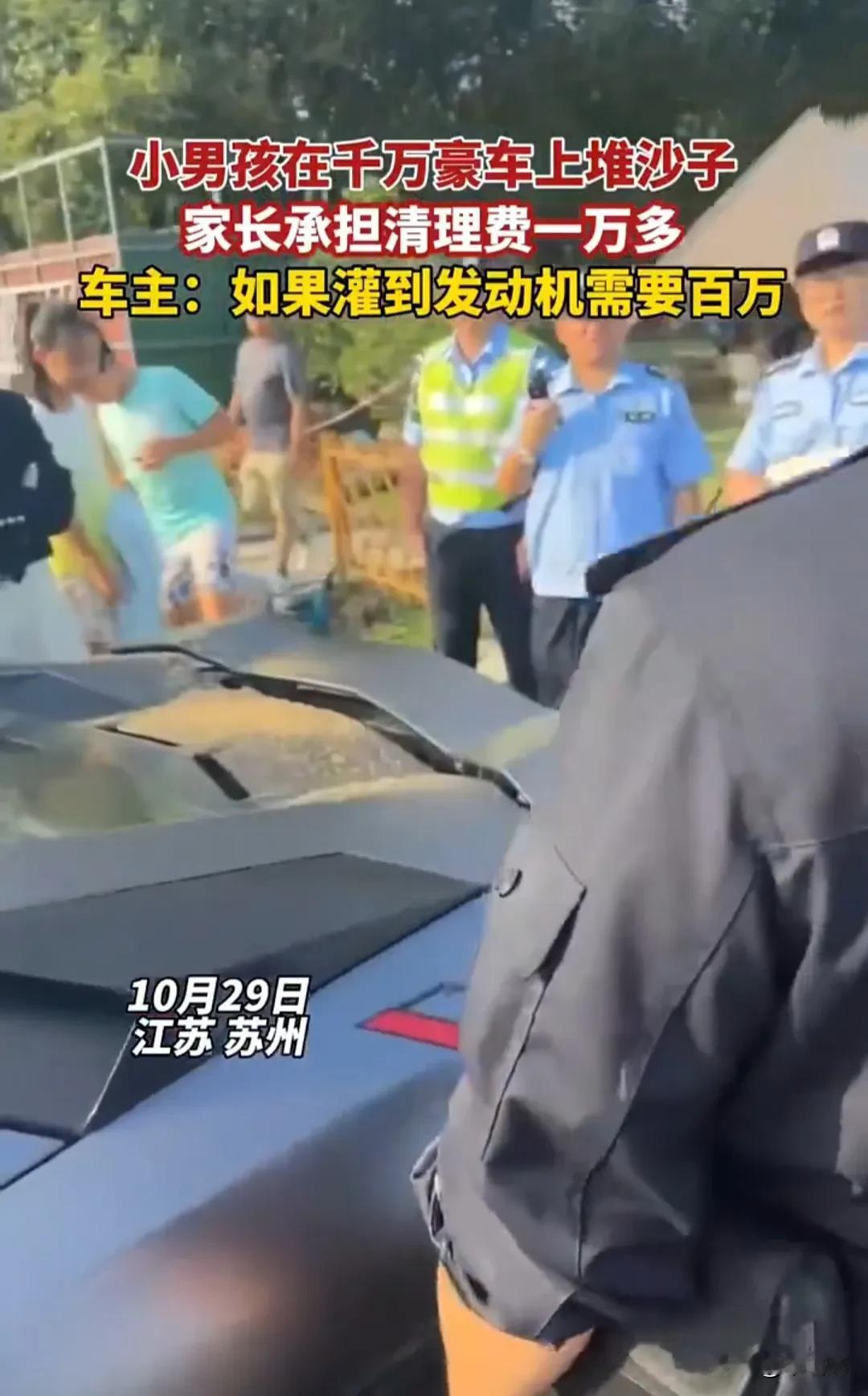熊孩子闯下大祸了,男孩在人家泊好的车上堆沙子玩,结果沙子漏进了发动机后仓。 车主发现后迅速报警,帽子叔叔调取监控,很快找到了肇事男孩,男孩也承认了是自己所为。 帽子叔叔联系其监护人,男孩的爸爸听后不屑一顾:“多大的事情,无非就是赔点钱,至于如此大惊小怪。” 等帽子叔叔说明被男孩堆沙的是辆什么车,并且清理费要多少后,男孩爸爸傻眼了。 这是车主花800多万购置的限量款兰博基尼大牛,买回来后,车主又花了200多万改装,总价值超过千万。 现在沙子漏到了发动机后仓,光清理费就要1万多。 4S部门介绍,幸好沙子没有直接灌到发动机内,如果沙子直接灌进发动机,光清理维修费就要上百万。 玩个堆沙就让老爸的钱包瘪掉1万多,这个教训够他记得一辈子了。 每个熊孩子背后都有一个熊家长,对爱护犊的熊家长来说,自家孩子无法无天,无论闯下多大的祸,在他口中永远一句话:孩子还小,不懂事,多少钱我赔。 一味的溺爱纵容,只会让孩子更加肆无忌惮,最终闯下捅破天的大祸,到时候才让你追悔莫及。 校园之外没有温室,长大之后没有儿戏,你现在舍不得教育,将来社会会替你狠狠教育。