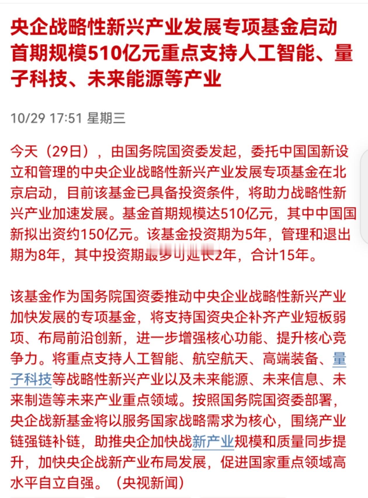 央企战略性新兴产业发展专项基金启动 首期规模510亿元重点支持人工智能、量子科技、未来能源等产业
