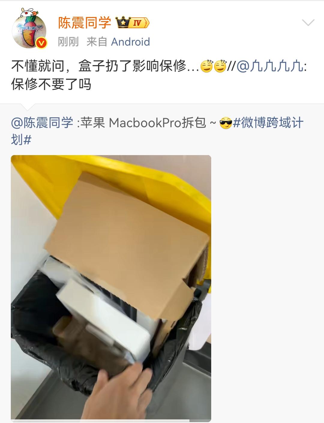 陈震:苹果 MacbookPro拆包~[酷] 网友:保修不要了吗? 陈震:不懂就问,盒子扔了影响保修?[呆无辜] 每次这种手机类的电子产品扔盒子都变成了增加话题度的东西的,陈晨有一次扔了某一家的盒子,被喷的不轻。 后来发现扔盒子这种东西是一个另外的流量,结果每一次拆包必扔盒子。 各位是怎么看的?欢迎评论区留言。