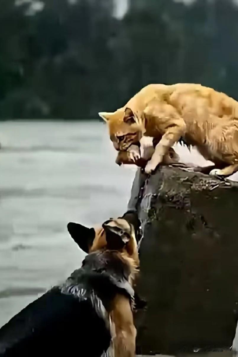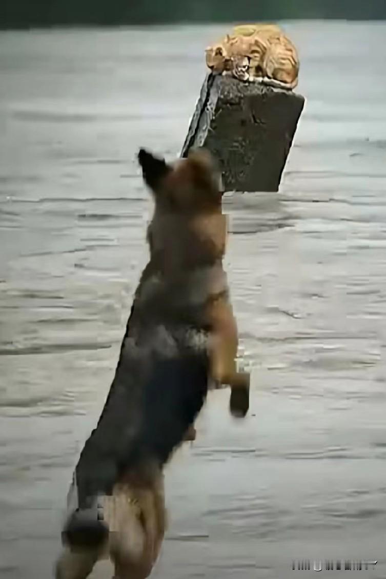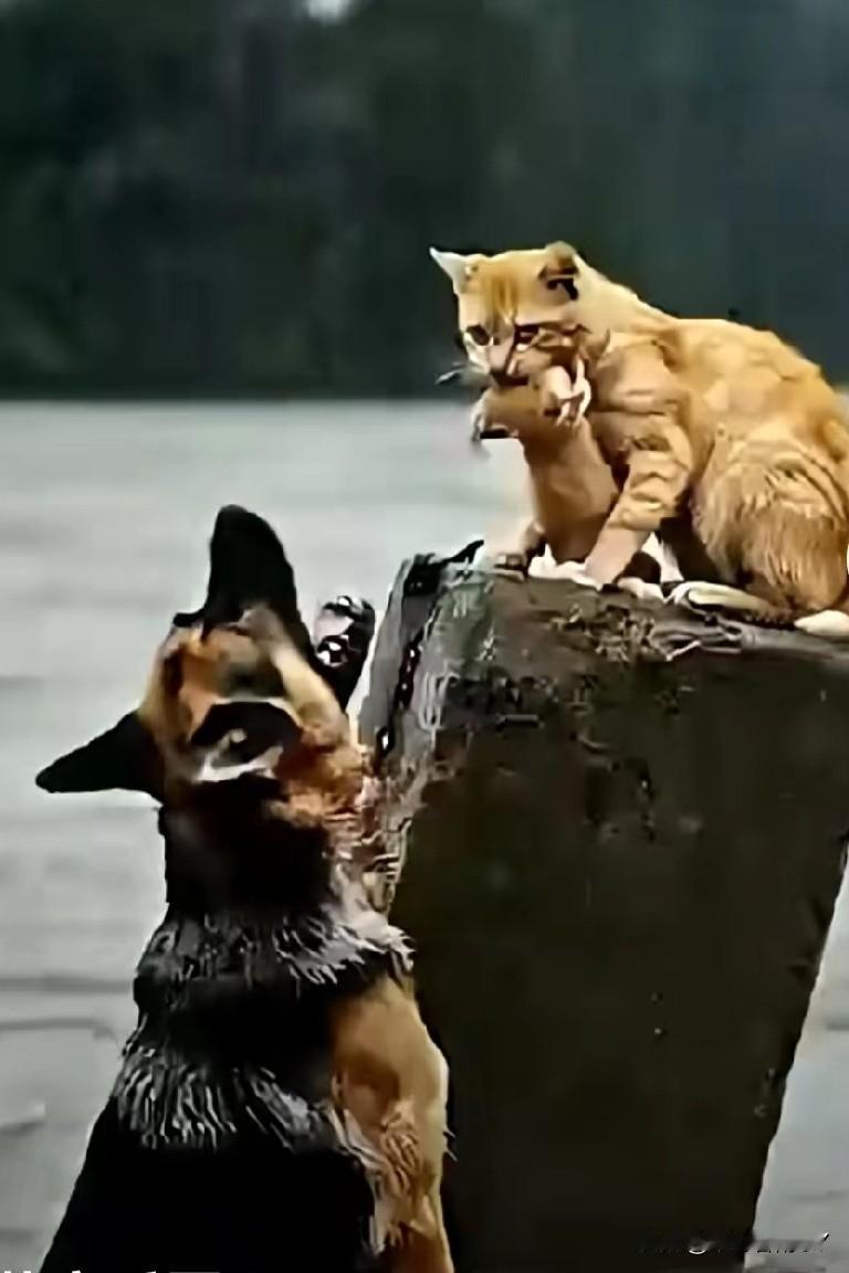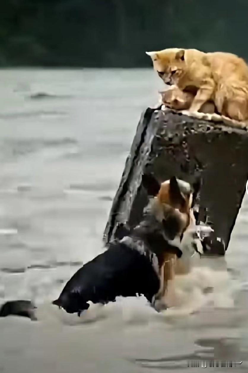 在汹涌的洪水中,橘猫妈妈紧紧护住幼崽,被困在一块水泥柱上,它不停地“喵、喵喵”急切呼唤着,孤立无援。 不远处,一只德国牧羊犬听到了叫声,飞奔而至,看到这一幕,它毫不犹豫地纵身跃入洪流,奋力游向猫妈妈,它让猫妈妈带着幼崽爬到自己背上,然后坚定地朝着岸边游去。 当三者在岸边互相依偎时,那跨越物种的温暖与勇敢,直抵人心。 这不仅是一场救援,更是生命与生命间的全力举托! 它让我们看到,在危难面前,善意与担当可以如此动人。