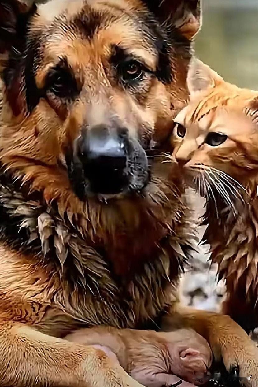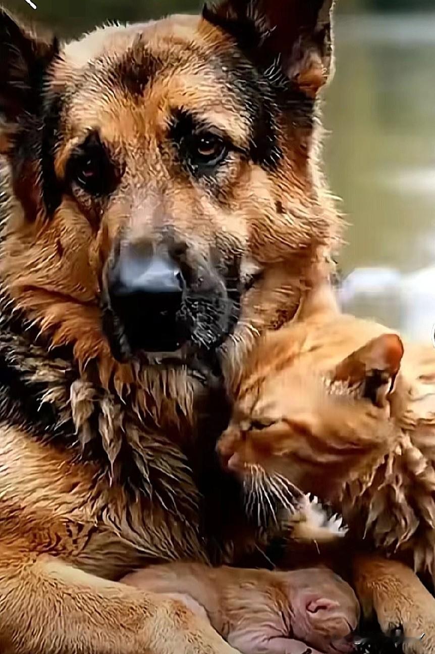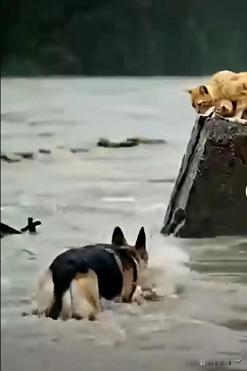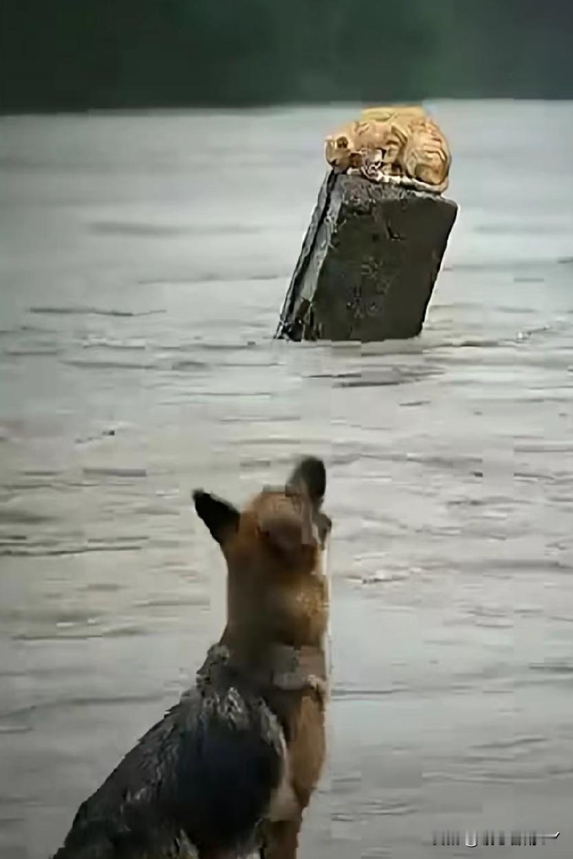 在汹涌的洪水中,橘猫妈妈紧紧护住幼崽,被困在一块水泥柱上,它不停地“喵、喵喵”急切呼唤着,孤立无援。 不远处,一只德国牧羊犬听到了叫声,飞奔而至,看到这一幕,它毫不犹豫地纵身跃入洪流,奋力游向猫妈妈,它让猫妈妈带着幼崽爬到自己背上,然后坚定地朝着岸边游去。 当三者在岸边互相依偎时,那跨越物种的温暖与勇敢,直抵人心。 这不仅是一场救援,更是生命与生命间的全力举托! 它让我们看到,在危难面前,善意与担当可以如此动人。