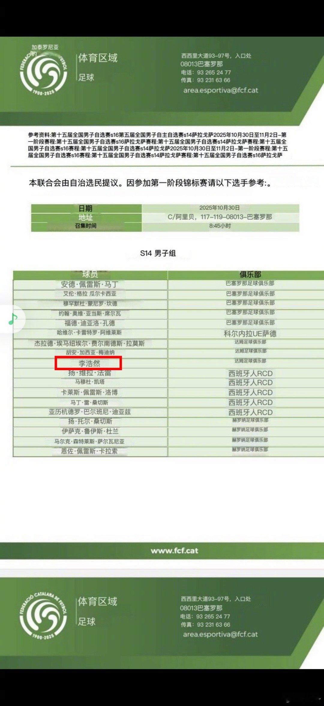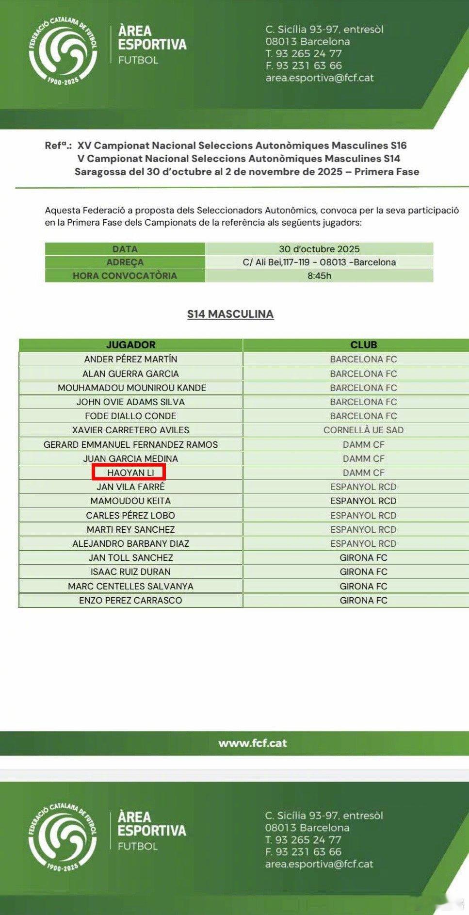 【历史性时刻】中国足球小将 留洋球员李昊炎入选加泰足协U14联队18人正式名单!