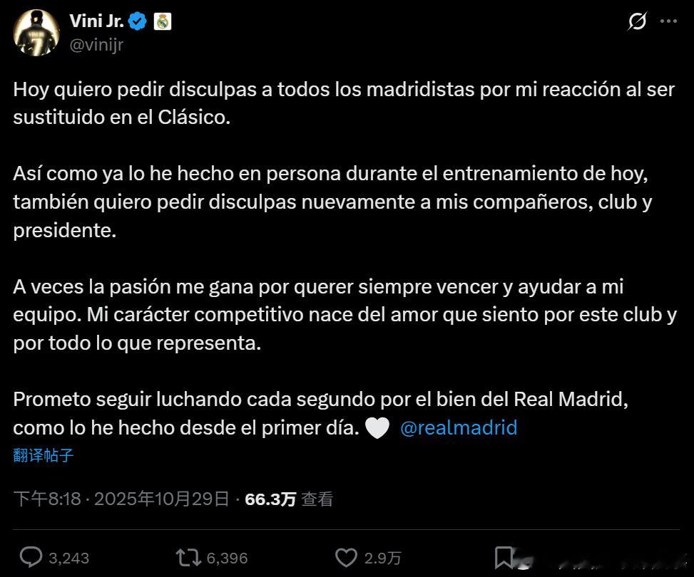 【成长了】威尼修斯刚刚在社媒发文致歉,就在国家德比中被换下后的不满和抱怨()向皇马球迷、队友、俱乐部和主席表示歉意。