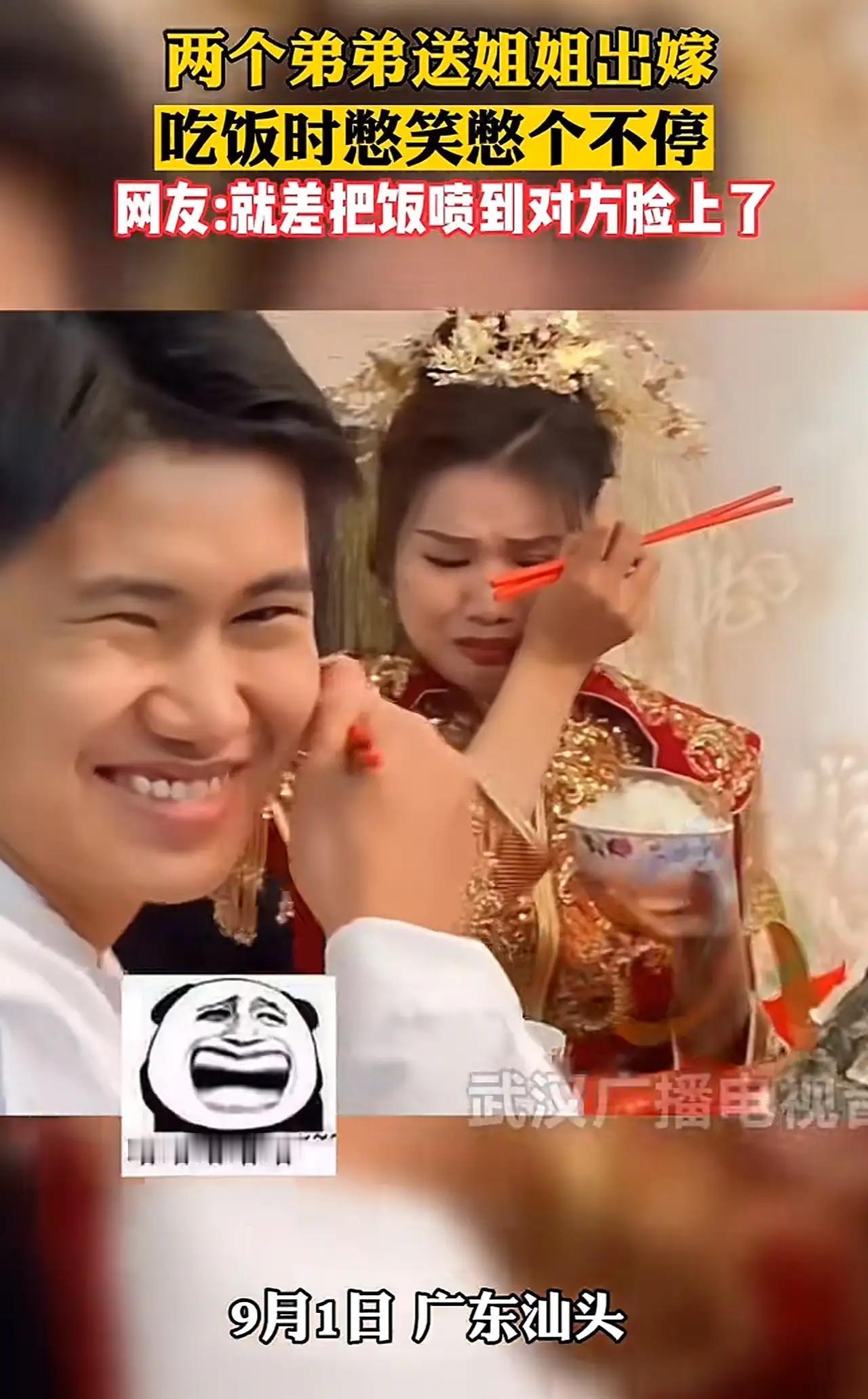 两个弟弟送姐姐出嫁,吃分家饭时憋笑个不停 网友:就差把饭喷对方脸上了 那天,家里热闹非凡,亲朋好友齐聚一堂,为姐姐的出嫁宴欢庆。两个弟弟一直调皮捣蛋,尤其是在吃分家饭的时候,笑点似乎特别低。姐姐穿着喜庆的婚纱,脸上挂着幸福的笑容,而弟弟们却偷偷打趣,时不时用筷子夹起菜肢,瞄准姐姐的碗偷偷一夹,逗得现场笑声不断。 最搞笑的是,弟弟们为了逗姐姐,竟然开始用筷子夹起饭粒,然后用嘴吹到对方脸上,惹得大家都忍俊不禁。姐姐也忍不住笑出声,嘴角扬起一抹幸福的笑意。而旁边的亲戚朋友看着这一幕,也都笑得合不拢嘴,纷纷拿出手机记录这温馨又搞笑的场景。 有人调侃:“就差把饭喷到脸上了,真是兄弟情深啊!”也有人笑着说:“这才是真正的家人,哪怕是吃饭,也能这么欢乐。”现场的气氛轻松愉快,仿佛一切都在为姐姐的幸福增添一份温暖。 网友们看到这些温馨又搞笑的画面,也纷纷留言:“兄弟俩太有趣了,真是家人之间最纯真的笑料。”还有人感慨:“这样的兄弟情,才是真正的宝贵,生活中的点滴都值得珍惜。”有人调侃:“下一次聚会,估计还会有更多搞笑的桥段吧!” 这场简单的家族聚会,因兄弟间的调皮和姐姐的幸福,变得格外温馨。笑声中,不仅仅是吃饭,更是家人间浓浓的爱与默契。在欢笑声中,姐姐的婚礼也留下了最美好的回忆。这样的日子,也许平凡,但正是这些点滴,让生活变得更加丰富多彩。
