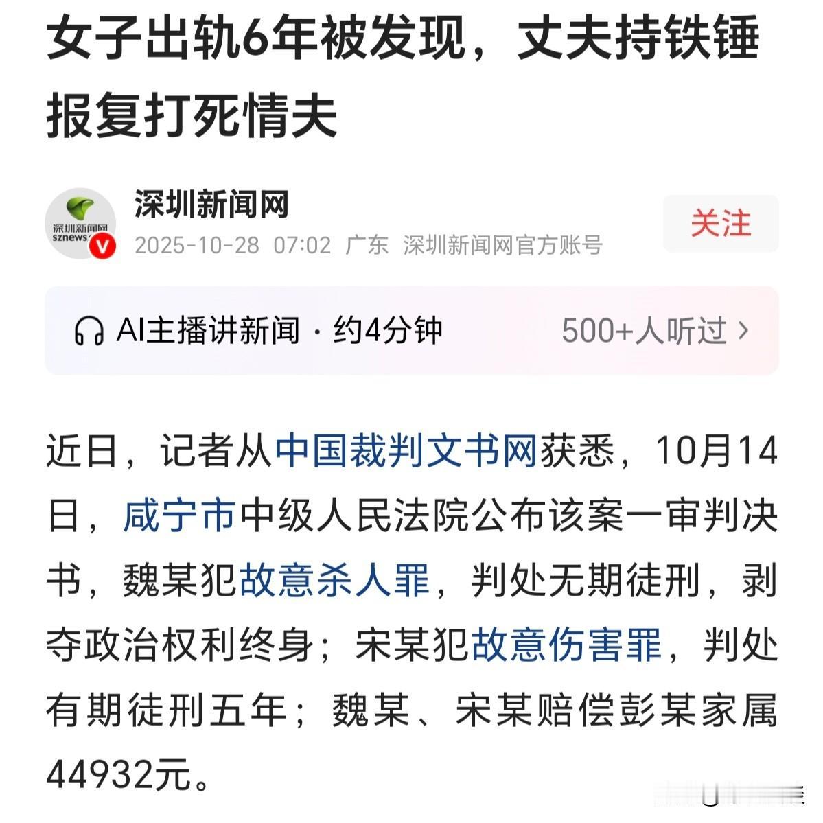湖北咸宁,男子和妻子结婚17年,没想到妻子却背着他和别人好了6年,男子得知妻子的丑事红了眼,逼问妻子到底怎么回事,妻子害怕不敢说实话,谎称是被胁迫的,男子怒不可赦,操起铁锤让妻子带路,找情人算账,不想气头上下狠手,朝着情夫的头部一顿猛锤,情夫因伤势过重身亡,这下二人悲剧了,双双获刑! 宋女士原本有安稳的家庭,儿女双全,丈夫勤劳顾家,可她不满足,背着丈夫找了个相好的。 她没想过离婚,又耐不住寂寞,因此每次见面都小心翼翼。 就这样她和情人好了6年,她以为可以一直这样隐蔽下去,即享受家庭的安稳,又享受外面的刺激。 可天下哪有不透风的墙,她们的事还是露出蛛丝马迹。 2024年春天,丈夫魏某从姐姐口中听闻妻子可能出轨的消息,多年的信任瞬间崩塌。 他回家问宋某有没有这回事,妻子矢口否认,这种事没抓住把柄,谁都不会承认。 可魏某心里过不去那道坎,怀疑的种子在他心里生根发芽,他一次次逼问,妻子开始嘴硬,后来心里防线崩塌承认了。 看到丈夫红了眼,宋女士怕了,她没敢说实话,哭着说自己是被胁迫的。 原来,2018年,宋女士在网上闲聊,认识了彭某,俩人偷偷好上了,这一瞒就是六年。 魏某背愤怒冲昏了头脑,一听妻子被强迫,他当即决定找彭某算账。 宋女士极力阻拦,保证再也不和彭某联系了,以后好好过日子。 可魏某此刻哪里能听进去这些,他操起一把铁锤,命令妻子带路。 宋女士吓得腿都软了,现在后悔也来不及了,可丈夫正在气头上,这种局面根本控制不了。 她嘴上劝阻别冲动,脚步却还是跟着丈夫上了车,甚至在途中,向丈夫清晰指明了彭某的工作地点。 当日傍晚7点刚过,魏某驾驶一辆面包车,在妻子的指引下来到彭某的工作所在地。 车子停在公司正对面的路边,两人立刻下车,沿着路边快步走向公司大门。 此时,彭某正在公司保安室里值班,负责着厂区的安全。 按照两人事先商量好的计划,宋女士先上前,呼喊彭某让他打开门口的伸缩门。 待彭某按下开关,伸缩门缓缓打开一条缝隙时,宋女士迅速上前,用身体挡在中间,防止彭某突然关门。 就在宋某挡住门的瞬间,魏某从身后拎着一把铁锤冲了过来,直逼保安室门口。 彭某见状,顿时察觉情况不对,急忙伸手想去关门,可魏某已经挤进来。 他高高举起铁锤,朝彭某捶打过去,彭某当场被打倒在地。 魏某满肚子怒火,没有停手,而是继续手持铁锤,朝着倒地的彭某头部猛砸。 宋某紧跟着走进保安室,看到彭某躺在地上一动不动,顿时慌了神,急忙拉住魏某。 看着满地血渍,她怕出事,赶紧掏出手机拨打120急救电话。 另一边,魏某将手中沾着血的铁锤丢在保安室门口,随后拿出手机拨打了110,主动向警方投案。 之后,两人都没有离开现场,就在原地等待民警到来。 当晚7点20分左右,120急救车呼啸而至。 医生迅速对彭某进行检查和抢救,但彭某已经没有了生命体征。 后续经过专业鉴定,彭某被钝性物体(即铁锤)反复打击头部,导致开放性重型颅脑损伤,最终不治身亡。 《刑法》第232条 故意杀人的,处死刑、无期徒刑或者十年以上有期徒刑;情节较轻的,处三年以上十年以下有期徒刑。 魏某在发现妻子与彭某的婚外情后,持铁锤多次击打彭某头部,其行为构成故意杀人罪。 这起案件系婚姻家庭矛盾激化引发的“激情犯罪”。 魏某作案后主动投案构成自首,但因其行为导致他人死亡,后果严重,最终被判处无期徒刑,剥夺政治权利终身。 《刑法》第234条 :故意伤害他人身体的,处三年以下有期徒刑、拘役或者管制。犯前款罪,致人重伤的,处三年以上十年以下有期徒刑;致人死亡或者以特别残忍手段致人重伤造成严重残疾的,处十年以上有期徒刑、无期徒刑或者死刑。 宋女士虽未直接实施击打行为,但与她的不检点行为有直接关系。 而且明知魏某携带铁锤欲报复彭某,仍指引魏某找到彭某的值班地点。 并按约定喊门、挡门,为魏某实施伤害创造了条件。 她的行为与彭某的死亡存在直接因果关系,属于共同犯罪中的从犯。 但她发现彭某倒地不起,第一时间拨打120,对彭某主动救治,应减轻处罚。 宋某构成故意伤害罪,综合其情节,被判处有期徒刑5年。 彭某的家属不依不饶,要求魏某、宋某共赔偿84.5万元。 法院审理认定,彭某明知宋女士有家庭,还与其纠缠,其行为违背公序良俗,也是案件的矛盾点。 最后,法院仅支持彭某家属提出的44932元丧葬费请求,其余请求因不符合法律规定被驳回。 宋女士因不检点亲手毁掉安稳的家庭。 魏某被愤怒冲昏了头,用铁锤断送了别人的命,也把自己的后半生搭进去。 彭某明知对方有家庭还纠缠,最后丢了性命。 说到底,婚外情没有赢家,一时的糊涂和冲动,换来的是两个家庭一辈子的悲剧,真不值。 对此,你怎么看呢?