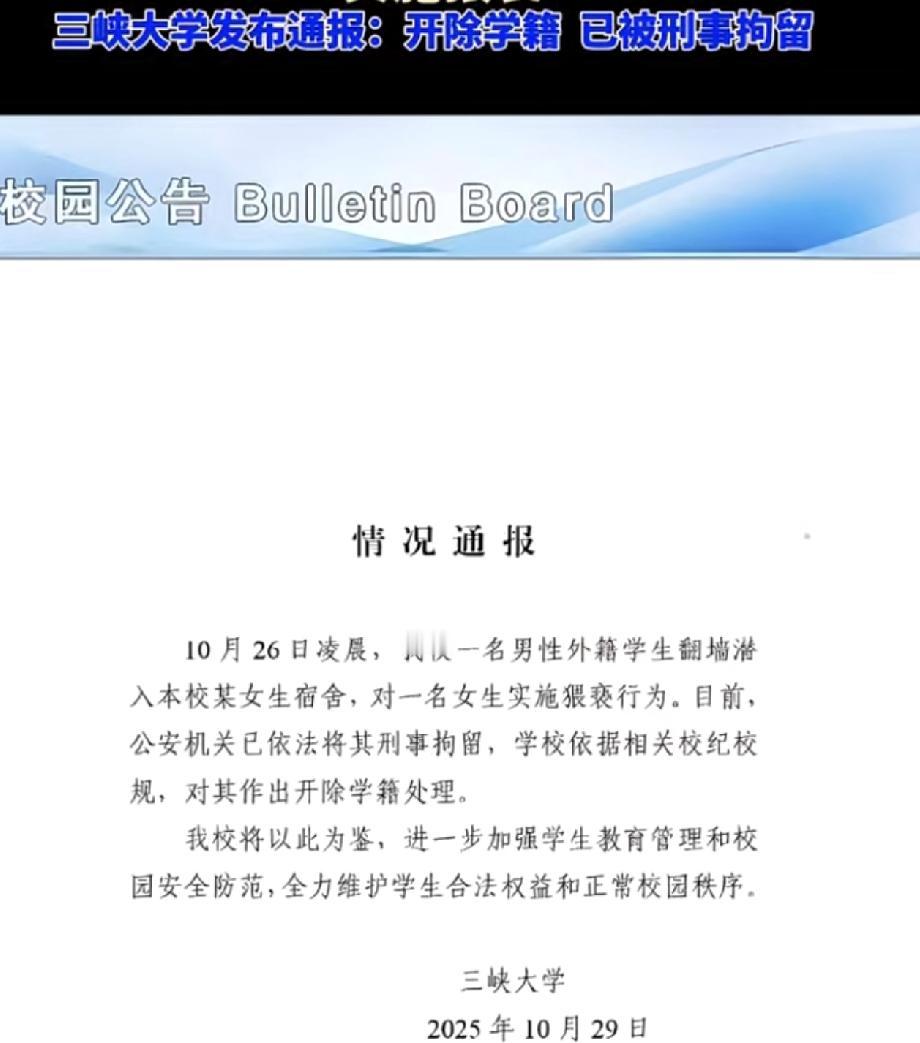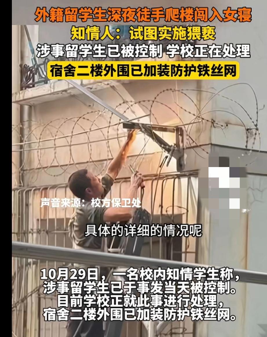 外籍学生爬楼闯入女生宿舍 意图猥亵被刑拘,并且已经开除学籍。 学校保安不是需要经常巡逻的吗? 这名黑人外籍学生是怎么徒手爬上去的? 他还是打着手电筒的。 如果没有人看到, 就有位女生遭遇毒手了? 湖北某大学,一名黑人外籍男留学生, 徒手爬楼闯入女生宿舍。 据知情人称,该男子试图猥亵女生。 目前,该留学生已经被控制, 学校在处理。 学校:“开除学籍,并送往刑拘” 宿舍二楼已经加装防护铁丝网。 该男子目前已经被刑拘, 并且已经被开除学籍 猥亵