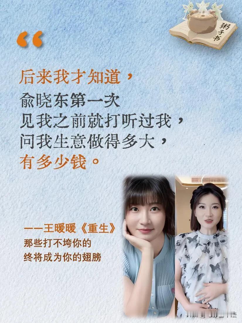 王暖暖如果早听到何炅老师这番话,就不会掉入俞晓冬精心设计的陷阱了。 何炅曾说,PUA这种情感控制其实特别好破,就是如果你突然遇到一个人跟你完美适配,那你一定要小心了,没有这样的人,他有可能是有目的接近你的,不要相信童话。 如果你看过王暖暖写的《重生》这本书,你就能明白,何老师这话真的是戳中要害,早听到早避坑,尤其结合俞晓冬这种靠完美人设行骗的事,更让人警觉,凡是关系进展太顺的,都要留个心眼,不是要防谁,而是为了保护自己。 王暖暖幸亏够运气够坚强,不然后果不堪设想,请大家记住何老师的话:遇到“完美适配”的人千万要警惕! 《重生》这本书详细讲述了王暖暖坠崖案的前因后果,讲述了很多坠崖案背后从在其他地方未公开过的细节,看这本书的时候你会后背发凉,同时你也能感受到一种向上的力量,因为这是一个受害者的亲身经历,也是一个平凡女性在命运绝境中破茧重生的故事,愿这本书能陪伴你在任何境遇中破土而生。 【重生】中国孕妇泰国坠崖案当事人王暖暖 写给女性的人生重启之书