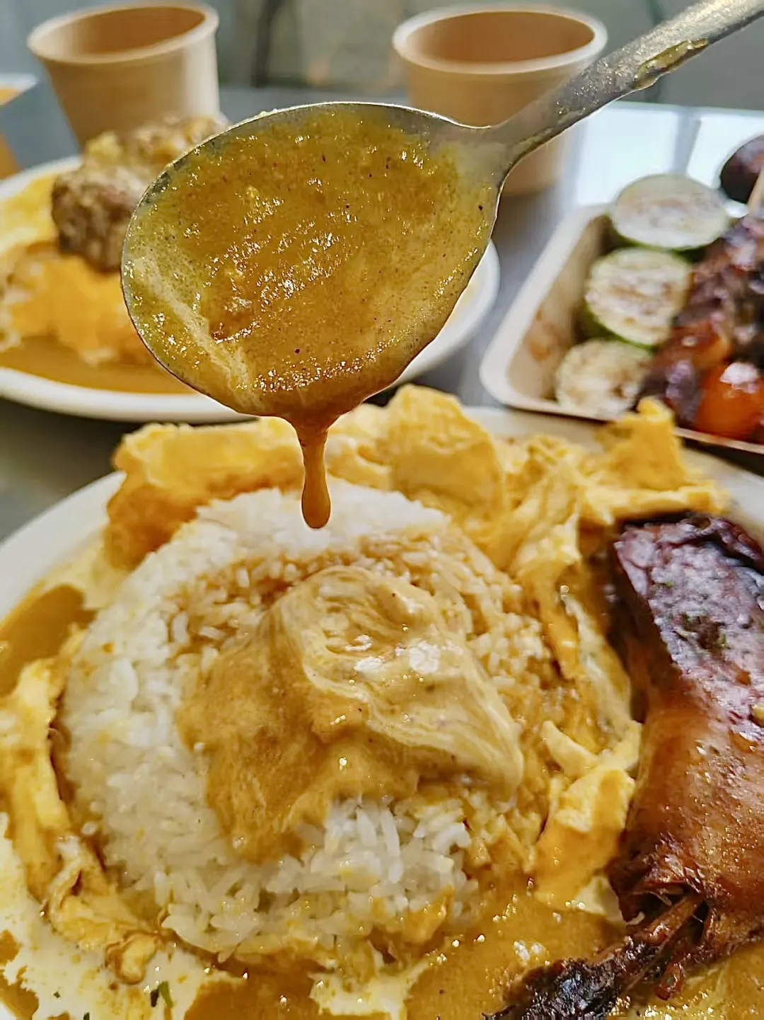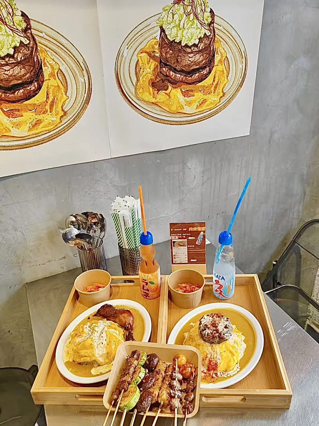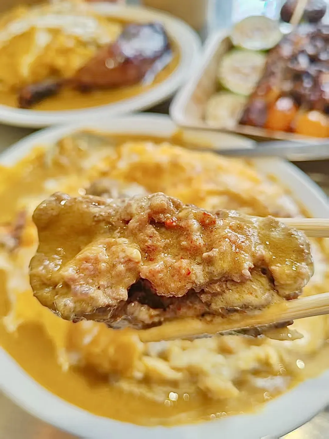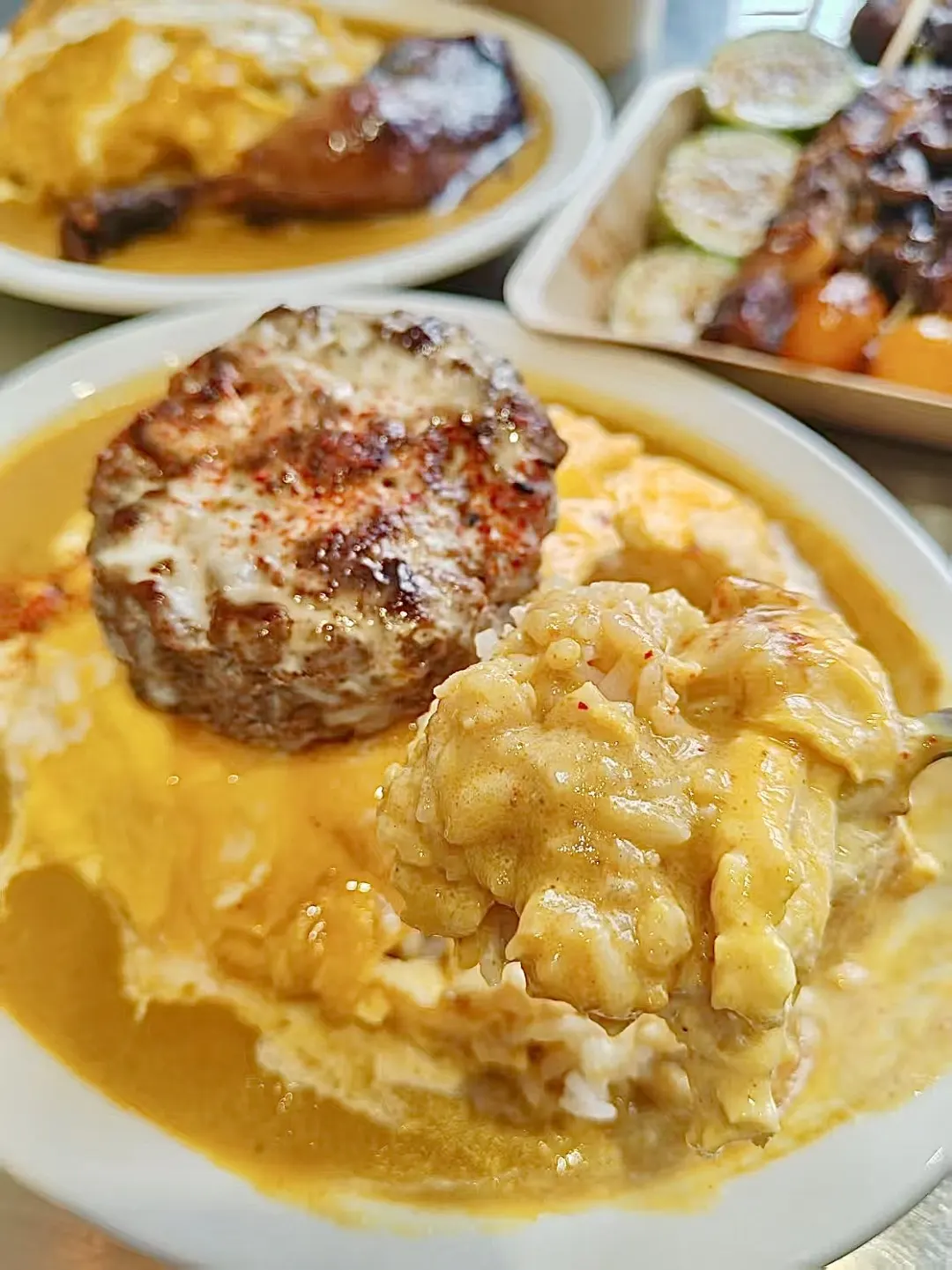 路过沙坡尾 真的座无虚席 馋到我了!! 这回终于吃上了!!! 🍔招牌澳洲和牛汉堡肉饭 份量真的太足啦!!牛肉饼肉质扎实 口感丰富有层次✨咖喱酱汁满满 很过瘾!! 🍗寿喜烧风味鸡腿肉饭 鸡腿肉外焦里嫩 很入味🤤米饭➕咖喱🍛搭配滑蛋 一口下去大满足👍🏻 有机会一定要试一下他们家的🍢烧鸟拼盘 不踩雷 食欲满满 鲜嫩细腻饱满多汁 真的好吃!!8点半以后就是全烧鸟的形式!!一直开到深夜哦~