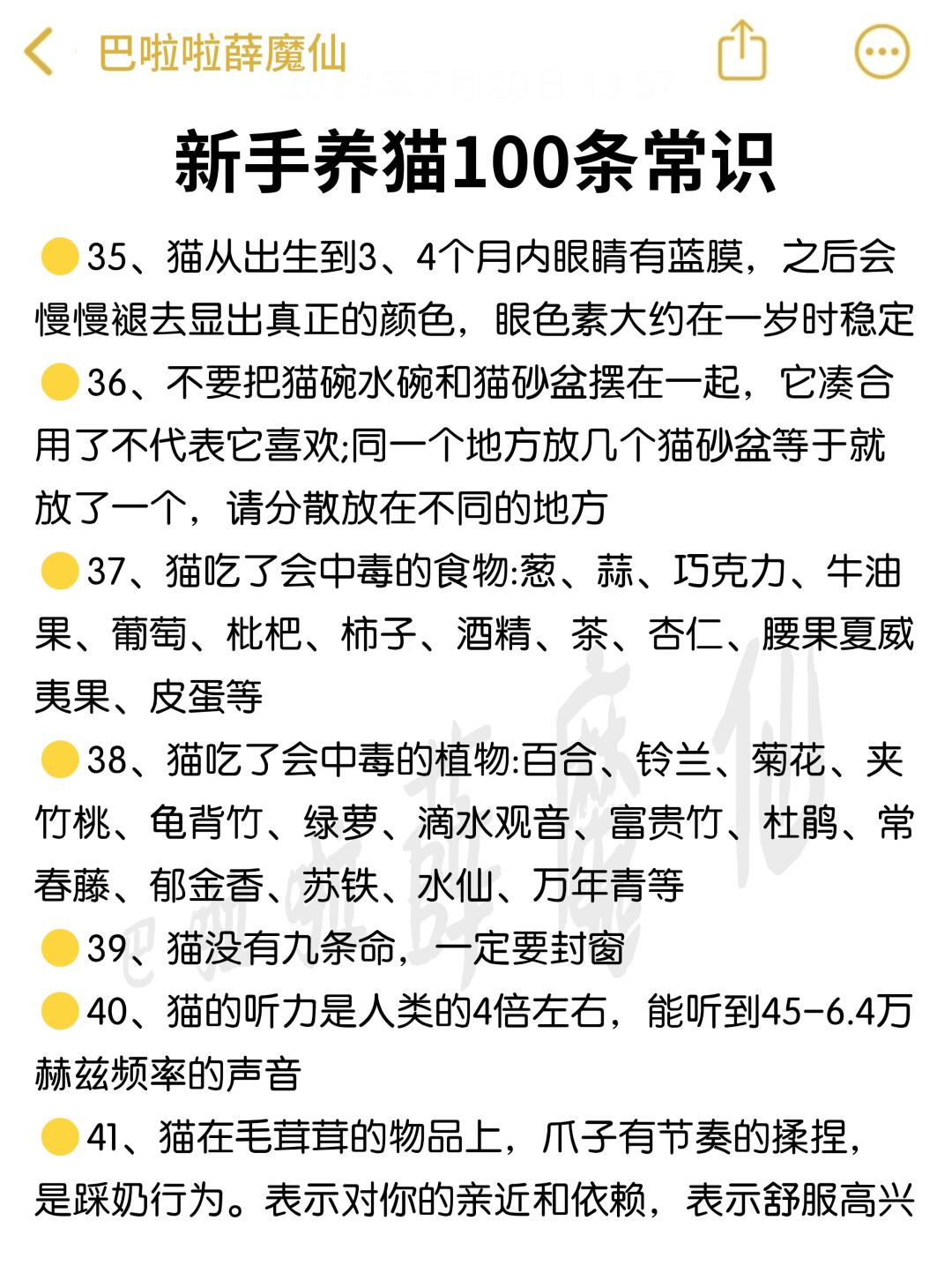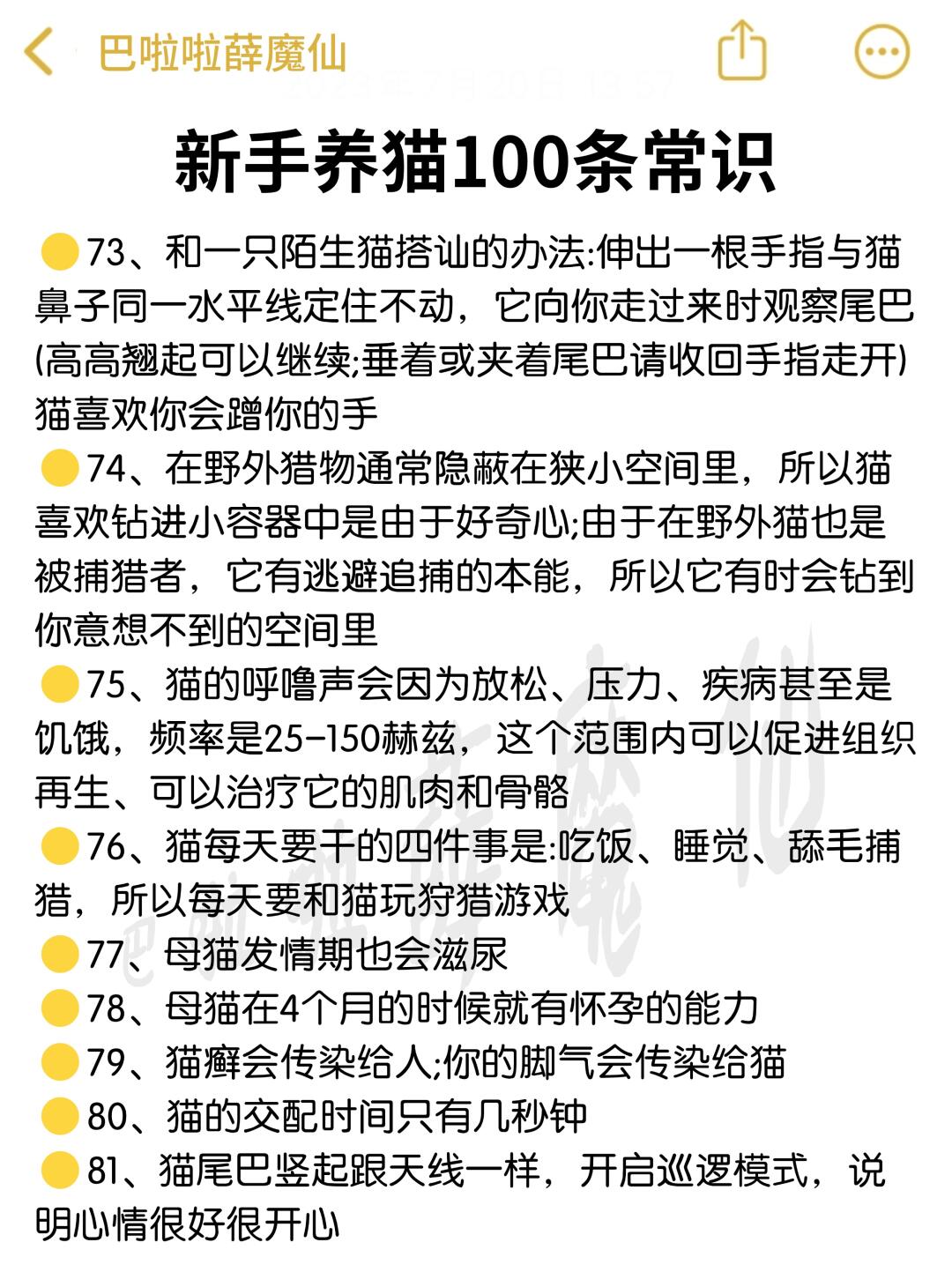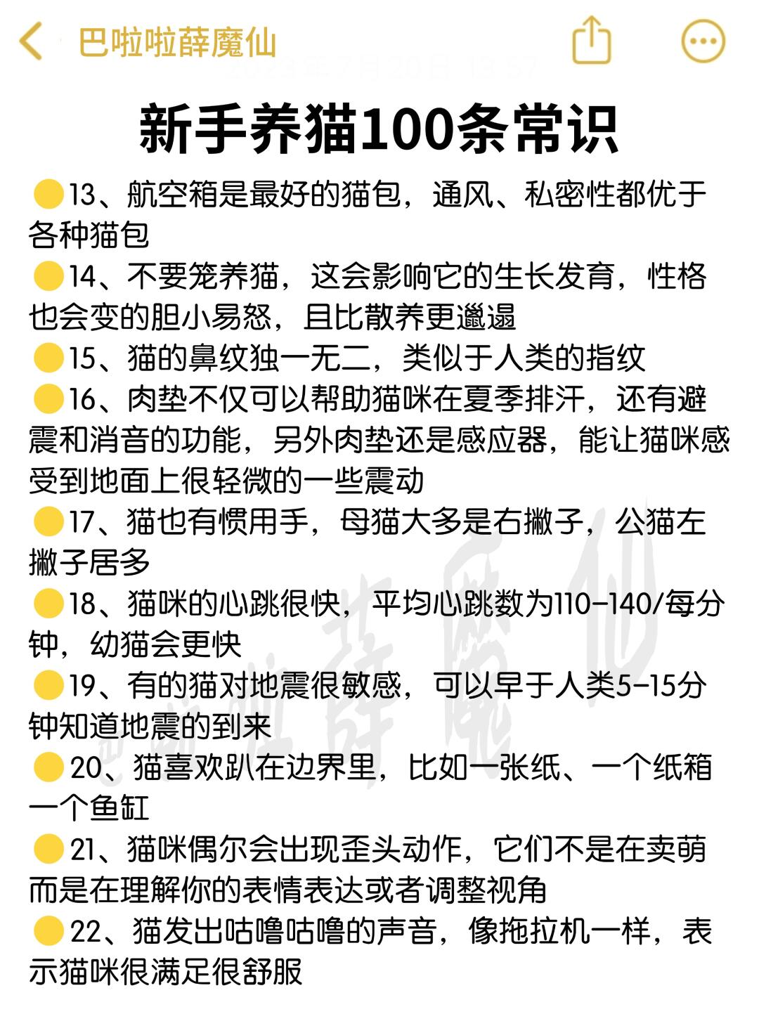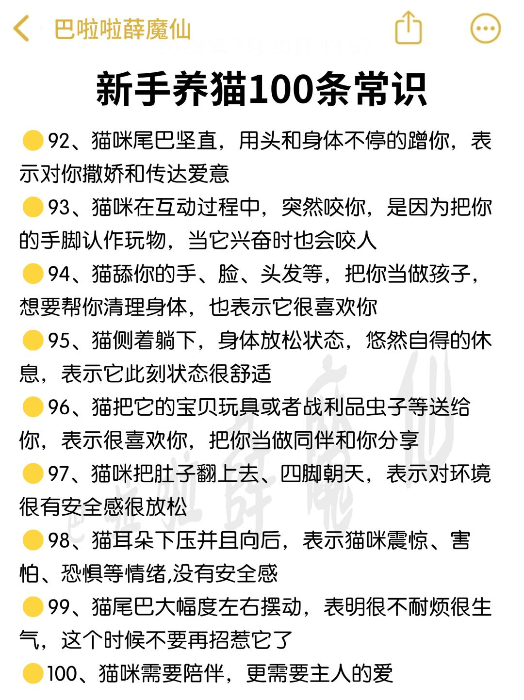 不懂就问有问必答 很多新手铲屎官在刚开始养猫的时候,对于养猫方面肯定会有很多疑问,👉整理了100条养猫小常识,快来学习吧~