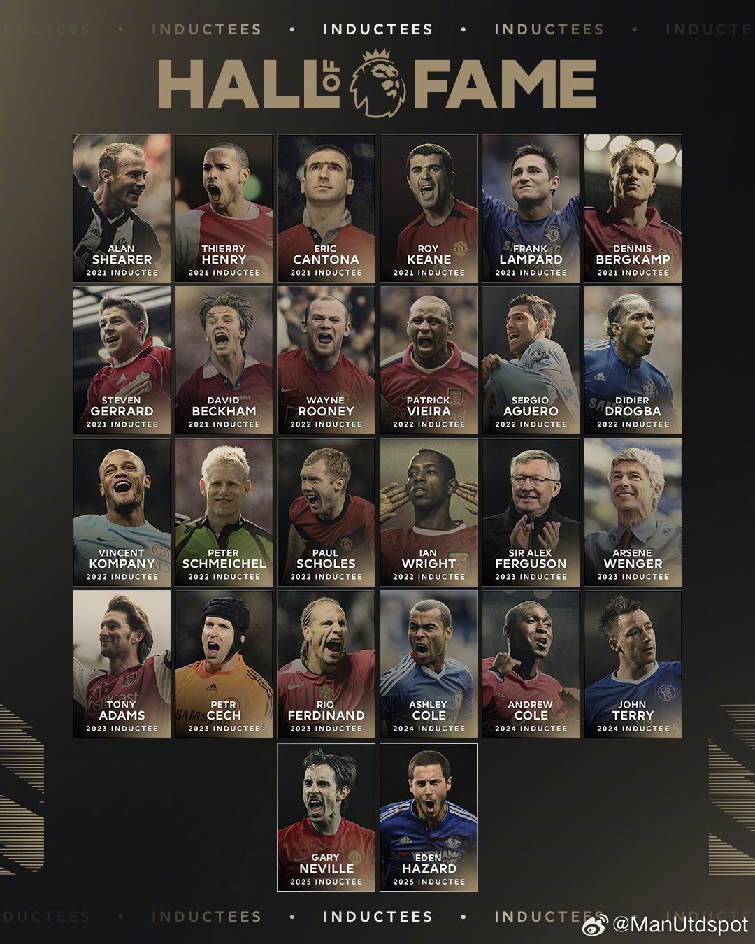 阿扎尔和加里内维尔成为唯二在2025年度加入英超名人堂的球员。