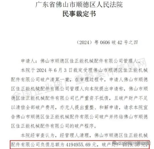 2025年1月23日,佛山市顺德区佳正能机械配件有限公司(简称“佳正能机械”),一家拥有14年历史的五金企业,因资不抵债,正式宣告破产。这家专注于机械配件、五金配件和塑料制品生产的制造商,曾凭借其产品质量在市场上占据了一席之地,然而,在内外部环境的重重压力下,最终还是未能逃脱破产的命运。