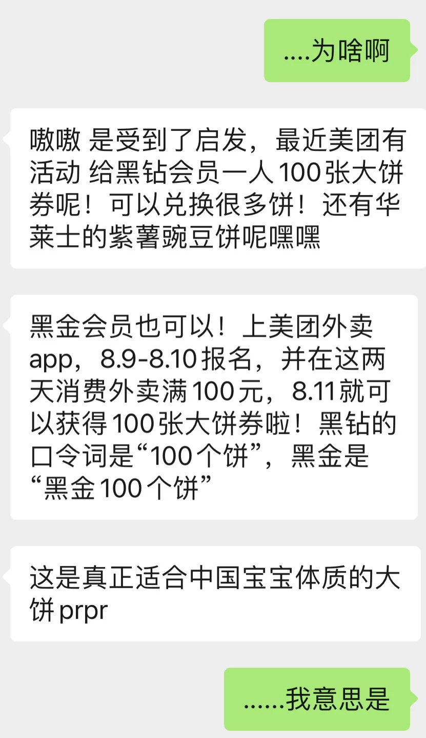 朋友:蛤 你觉得我这次写得不好嘛 本来还想给你用我的美团黑钻大饼券的,这个可以送给朋友 ...... 我:说什么呢我们小张爱玲😚😚 华莱士紫薯豌豆饼还有禄茗米兰虾饼我来啦prpr💕
