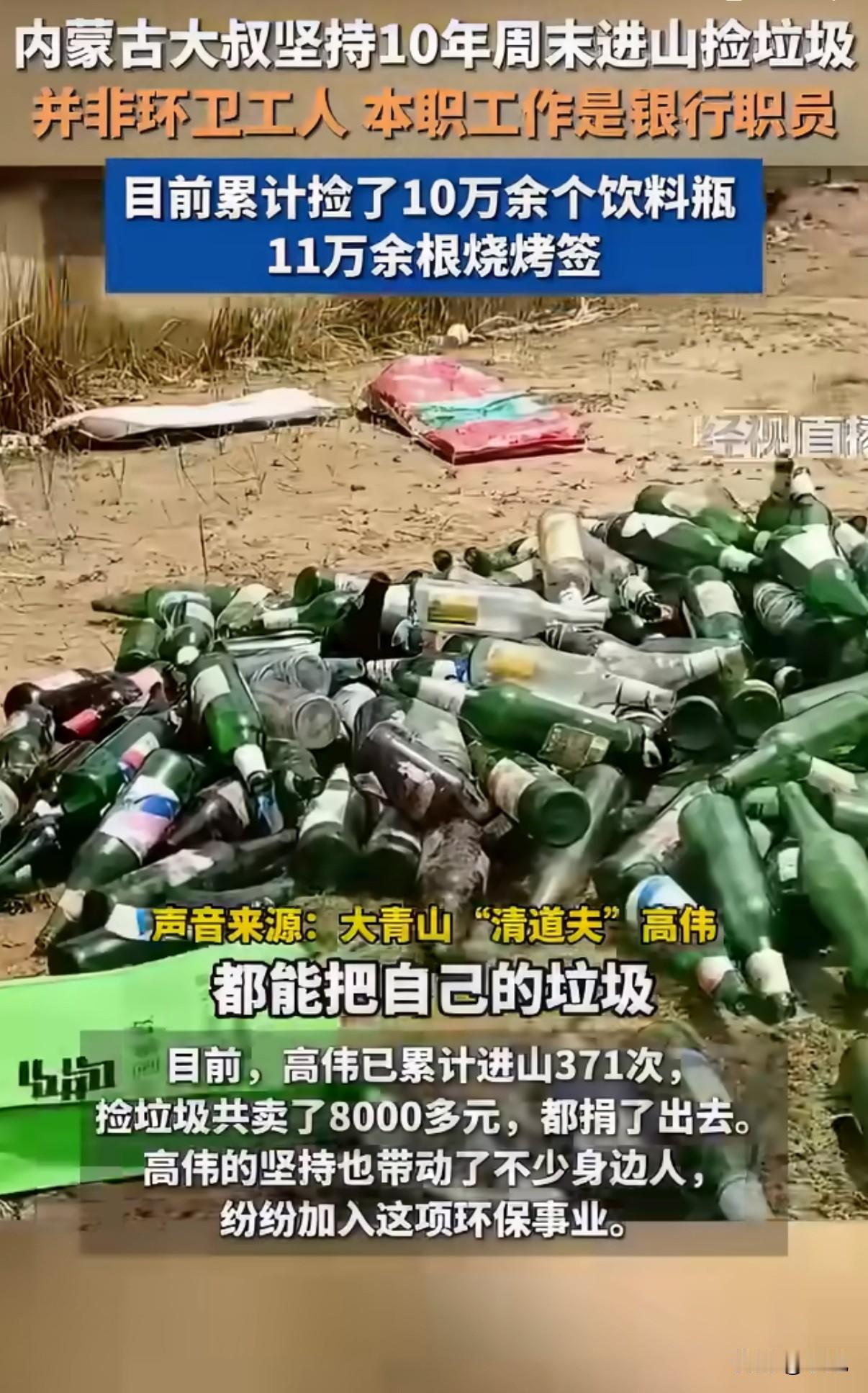 最暖心的不是捡了多少瓶子,而是他把卖废品的八千多块全捐了。 垃圾在他手里变成了爱心。这种简单的循环特别打动人——弯腰捡起的是废弃瓶罐,挺起腰杆时心里装的是绿水青山和人间温暖。 一个人,让垃圾都有了温度。