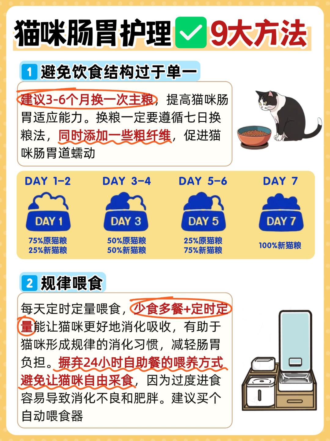 1⃣避免饮食结构过于单一:建议3-6个月换一次主粮,提高猫咪肠胃适应能力