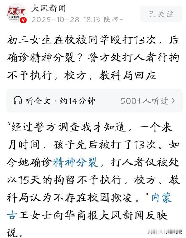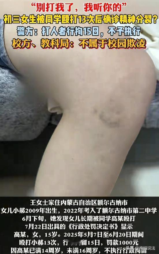 太恶劣了!内蒙古,一初中女生长期遭同班女同学霸凌,精神受创。孩子妈妈发现其精神恍惚、频繁要钱后追查,发现短短一个月内孩子竟被殴打13次,而学校却以隐私为由拒查监控。更气人的是,涉事学生因未满16岁未被拘留,学校还称这不属于霸凌,简直让人愤怒! 据大风新闻报道,王女士最近急得像热锅上的蚂蚁,女儿小郝才上初中,之前一直挺乖,最近却像变了个人,吃饭没胃口,睡觉也不踏实,还老找家里要钱。 王女士觉得不对劲,就追问女儿,可小郝支支吾吾,就是不肯说。 王女士没办法,只好去找女儿的小姨,小姨从同学那打听到,小郝一直被同班的高某欺负。 王女士一听,心里咯噔一下,赶紧去了学校,在民警的协调下,看了6月20日的监控,画面里,高某无缘无故就扇了小郝一耳光。 王女士看得心都碎了,想多看点监控,校方却以隐私为由,不让看。 王女士没办法,只能等民警通知,后来,民警通知她去看录像,王女士一看,差点没晕过去,女儿一个月竟然被打了13次。 王女士气得浑身发抖,高某家长知道后,想赔5万和解,王女士一口就拒绝了,她说,这不是钱能解决的问题。 可高某因为未满16岁,并没有被实际拘留,王女士觉得太不公平了,可也没办法。 这事闹得挺大,最后,学校因未尽到管理责任,被责令整改,并承担部分赔偿责任。校长被诫勉谈话,副校长等受处分。 可小郝却因为长期被霸凌,患上了精神 分 裂 症。 看着女儿这样,王女士心如刀绞,她不明白,为什么高某能这么肆无忌惮地欺负人,为什么学校不能早点发现,早点制止。 1,高某多次殴打同学,是否构成犯罪?未满16岁是否就能免于刑事处罚? 高某多次殴打小郝,情节恶劣,符合《刑法》中关于寻衅滋事罪等犯罪行为的特征。 但根据《刑法》第十七条,已满十四周岁不满十六周岁的人,犯故意杀人、故意伤害致人重伤或者死亡等严重犯罪才负刑事责任。 高某若未满16岁,对一般的殴打行为不承担刑事责任,这并非意味着其无需承担任何责任。 多次殴打同学,严重侵犯他人人身权利,虽不构成刑事犯罪,但违反《治安管理处罚法》。 《治安管理处罚法》第43条规定,殴打他人的,或者故意伤害他人身体的,处5-10日拘留,并处200-500元罚款;情节较轻的,处5日以下拘留或者500元以下罚款。具有殴打、伤害残疾人、孕妇、不满14周岁的人或者60周岁以上的人的等情节之一的,处10-15日拘留,并处500-1000元罚款。 高某在班级走廊里殴打小郝13次,是事实,对高某作出行政拘留15日并处罚款1000元的处罚。 因高某只有15岁,《治安管理处罚法》第21条规定,“违反治安管理行为人有下列情形之一,依照本法应当给予行政拘留处罚的,不执行行政拘留处罚:(一)已满十四周岁不满十六周岁的;……”最终,对高某作出不执行拘留的决定。 学校和家长应重视,通过教育、训诫等方式,让其认识到错误,防止再次发生类似行为。 2,学校有没有尽到管理责任?是否应该承担相应的法律责任? 学校对学生负有教育、管理和保护的职责。 依据《未成年人保护法》第39条和《学生伤害事故处理办法》第9条,有义务保护学生安全并及时制止欺凌。 监控显示霸凌持续多月,校方却以隐私为由拒绝家长查看,直到民警介入才提供部分录像,明显未尽到安全管理职责。 在此事中,学校未能及时发现并制止高某的霸凌行为,导致小郝多次被打,显然未尽到管理责任。 根据《民法典》第1201条,无民事行为能力人或限制民事行为能力人在学校受伤害,学校未尽到管理职责的,应承担补充责任。 3,高某的家长,作为监护人,有没有尽到监护责任?是否应该对小郝的伤害进行赔偿? 根据《民法典》第一千一百八十八条,无民事行为能力人、限制民事行为能力人造成他人损害的,由监护人承担侵权责任。 事后,家长提出5万和解被拒合理,因为精神 分 裂 症的治疗和康复费用远超此数,且霸凌对未成年人心理的伤害无法用金钱简单衡量。 高某家长作为监护人,未尽到监护责任,导致高某多次实施霸凌行为,应对小郝的伤害进行赔偿。赔偿范围包括医疗费、护理费、精神损害抚慰金等。 校园霸凌不是孩子间的玩笑,而是可能毁掉一生的暴力犯罪。面对校园霸凌,每个人都应成为守护者,学校要切实履行管理职责,家长要加强对孩子的教育和监管。