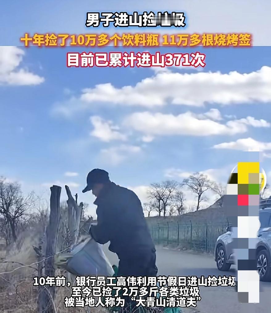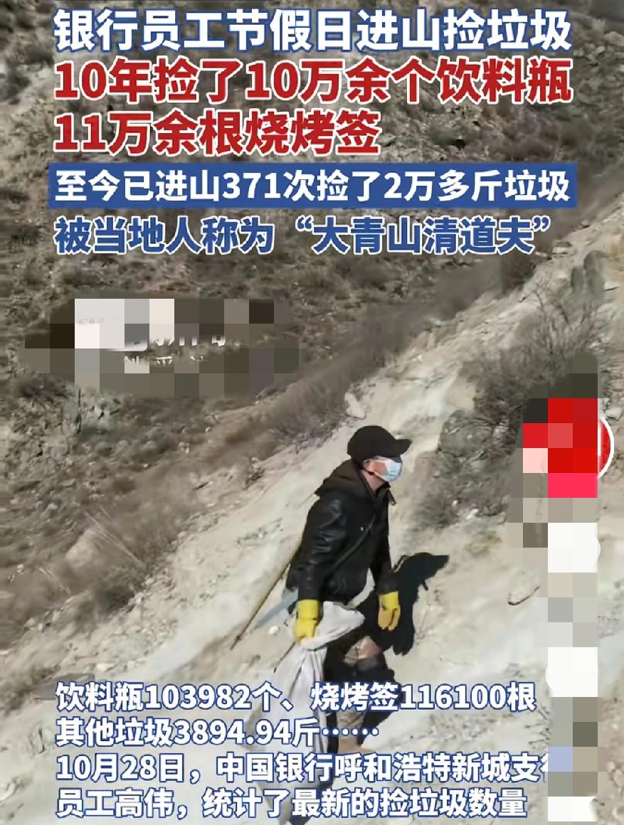 这下好了, 不止内蒙古,全国都知道了, 一位银行员工的节假日,全“耗”在了深山里,不为锻炼身体,只是为了捡垃圾。 内蒙古的高伟,用十年时间,371次走进山林,弯腰拾起了2万多斤垃圾,用自己的行为默默证明了,环保不只是靠口号,更重要的是付出行动。 总有人喊着环保口号,却连自己产生的垃圾都懒得带走。高伟不一样,他把银行记账的细致用到了捡垃圾上,10万多个瓶子、11万多根烧烤签都记得清清楚楚,甚至连卖废品的8000多块也全捐了出去。 最让人感到欣慰的是,他的妻子也被他的行动所感染。如今两人结伴进山,更是带动了上百人的志愿群一起努力。 这才是真环保:不靠豪言壮语,全凭日复一日的坚持,把“该做的”变成“在做的”。 多希望我们能够学高伟的实在劲儿。从身边的小事儿做起,把环保彻底做起来。你觉得普通做哪件最容易坚持?环保 捡垃圾 银行 社会