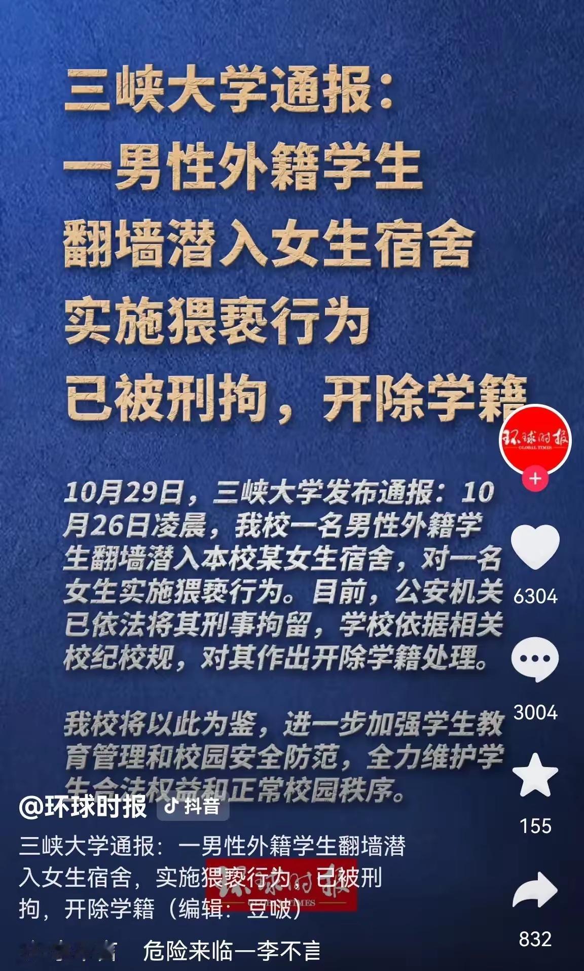 我想不明白,学校发一个公告为何要遮遮掩掩的?这件事情发生在10月26日凌晨一直到10月29日学校官方才发布通报,然后发布的通报却没有外籍学生的名字、国家。 此外,这真的是实施猥亵的行为吗? 大半夜的一个外籍学生竟然胆大到翻墙潜入女生宿舍,这明显就是强奸未遂。 如果不是这件事情在网络上持续发酵,我想可能学校连通告都不会发。 大家想一想,一个外籍学生胆子为什么会这么大?