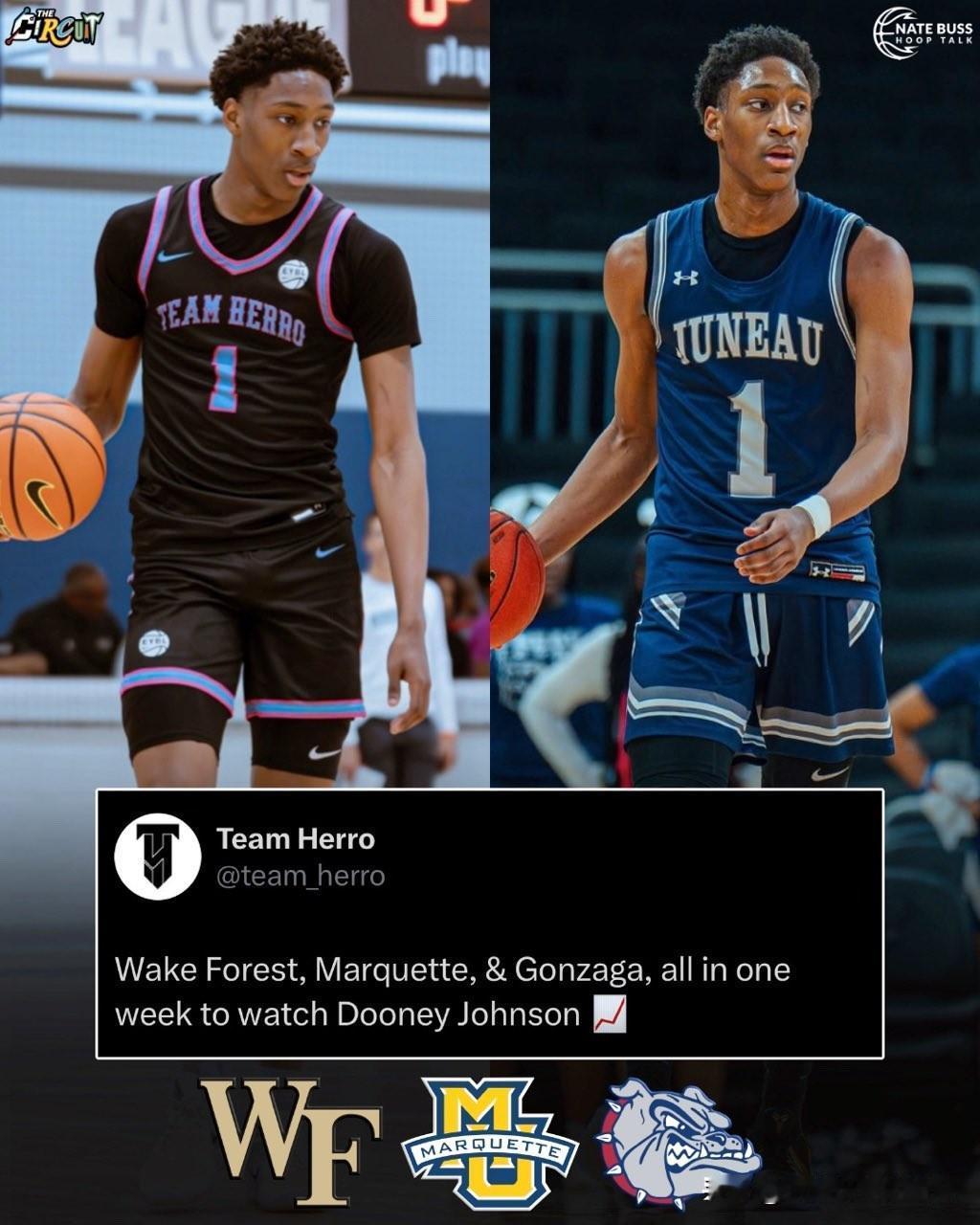 TOP30四星后卫Dooney Johnson宣布承诺NCAA男篮 冈萨加大学,来自威斯康辛州密尔沃基,身高6-5=196,还访问过马奎特大学,斗牛犬这届收到的第一位加盟者,高二赛季场均得到25.5分8.2篮板,约翰逊表示我们双方已经交流了一整年了,谈话非常愉快。