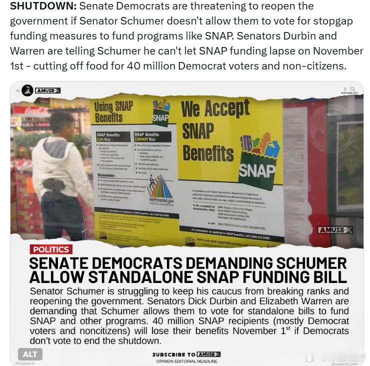 参议员德宾和沃伦告诉舒默,他不能让SNAP资金在11月1日中断——这将切断 4000 万民左党选民和非公民的食物供应。