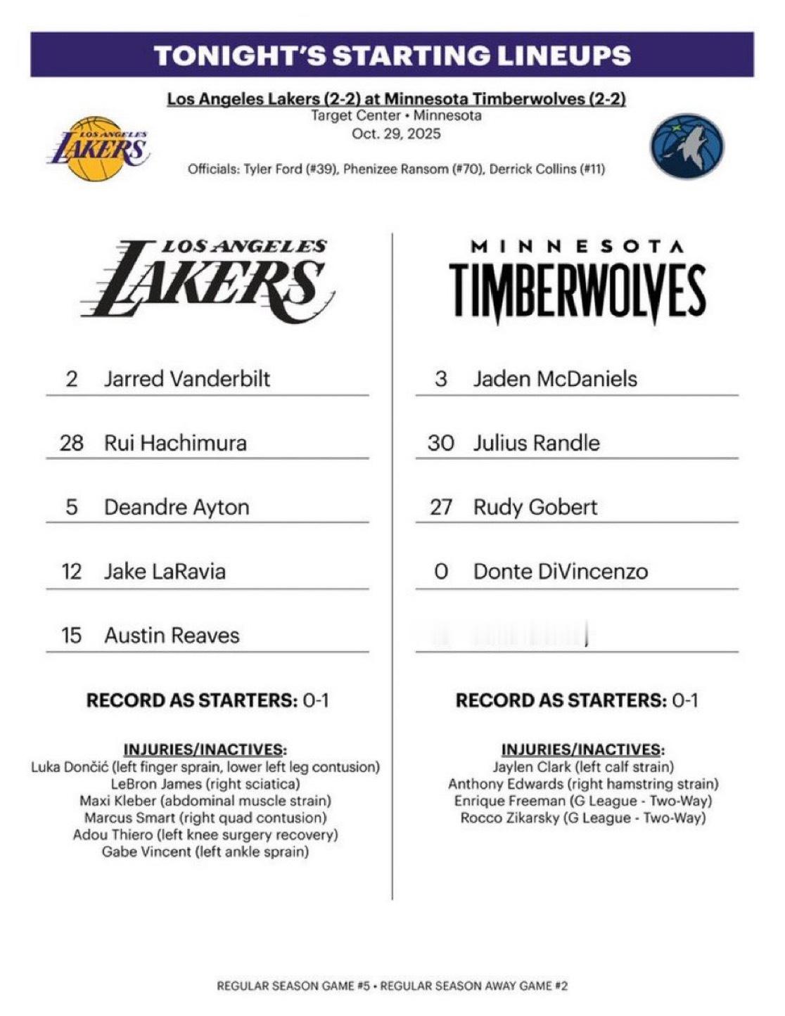 湖人首发:里夫斯、拉拉维亚、范德彪、八村塁、艾顿