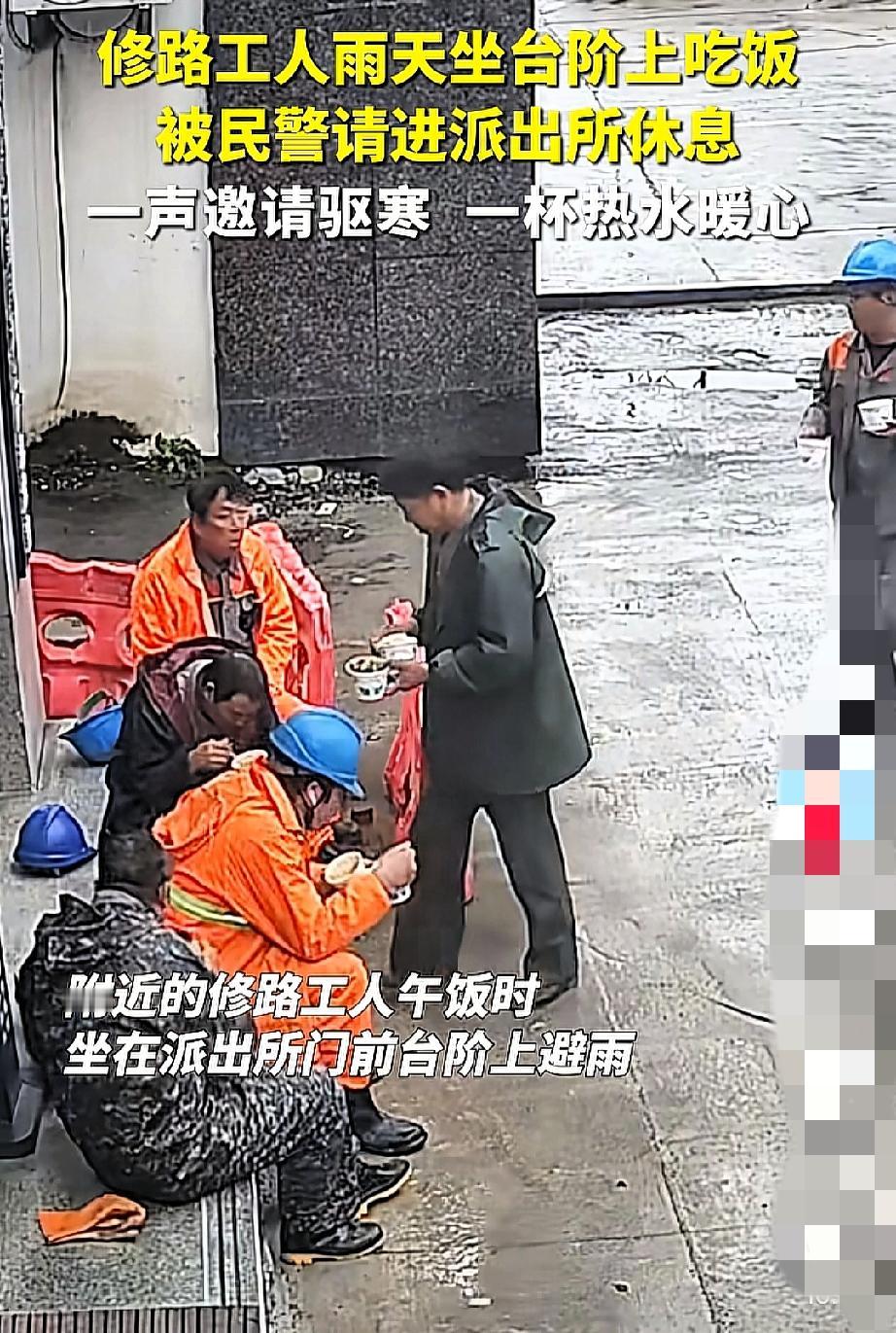 谁能想到,派出所门口躲雨的修路工人,竟被民警直接喊进屋里!湖北这群师傅午饭遇上大雨,蹲在台阶上扒盒饭,雨水飘进来就用胳膊挡,民警看见立马开门:“全部进来!”还倒了热水,半点没嫌他们身上的尘土。 我真觉得,这事儿比啥宣传都管用!工人师傅怕弄脏地面不敢进门的拘谨,咱都懂——劳动者总怕给人添麻烦,可这位民警偏不搞虚的,眼里看见的是他们修路的辛苦,不是身上的灰。比起喊“尊重劳动”的口号,一句“进来躲雨”、一杯热水,才是真把善意落到了实处。这哪是民警啊,是把老百姓的难处放在心上的“自家人”! 你们说,要是身边多些这样不端架子、肯搭把手的人,日子是不是会更暖?你遇过让你心里一热的小事吗?评论区聊聊!民警暖心的一幕 民警暖心帮忙 民警传递的温暖 民警暖心一幕 基层民警 民警帮忙 暖心执法人