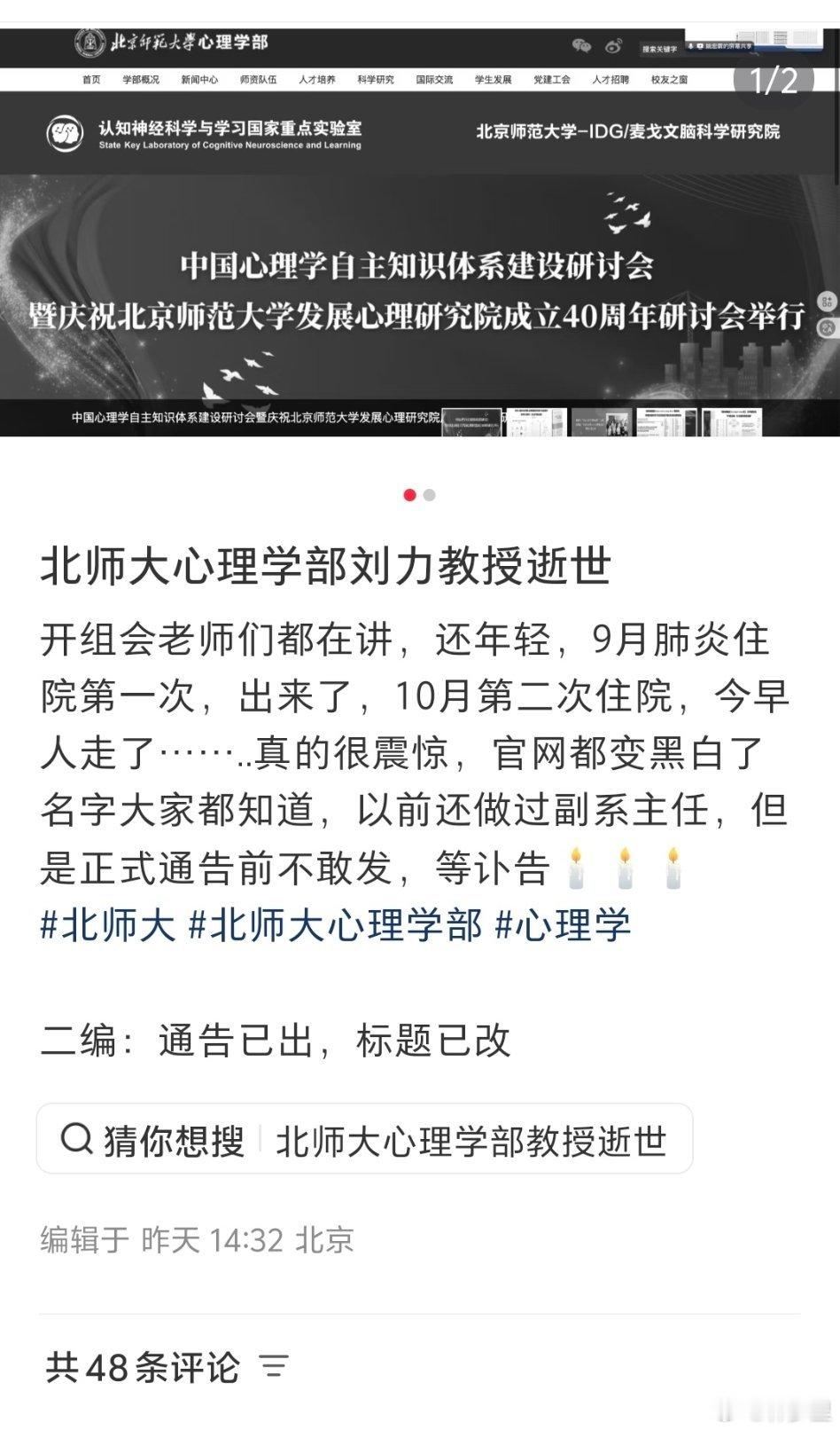 著名心理学家刘力教授逝世9月肺炎住院,10月第二次住院…