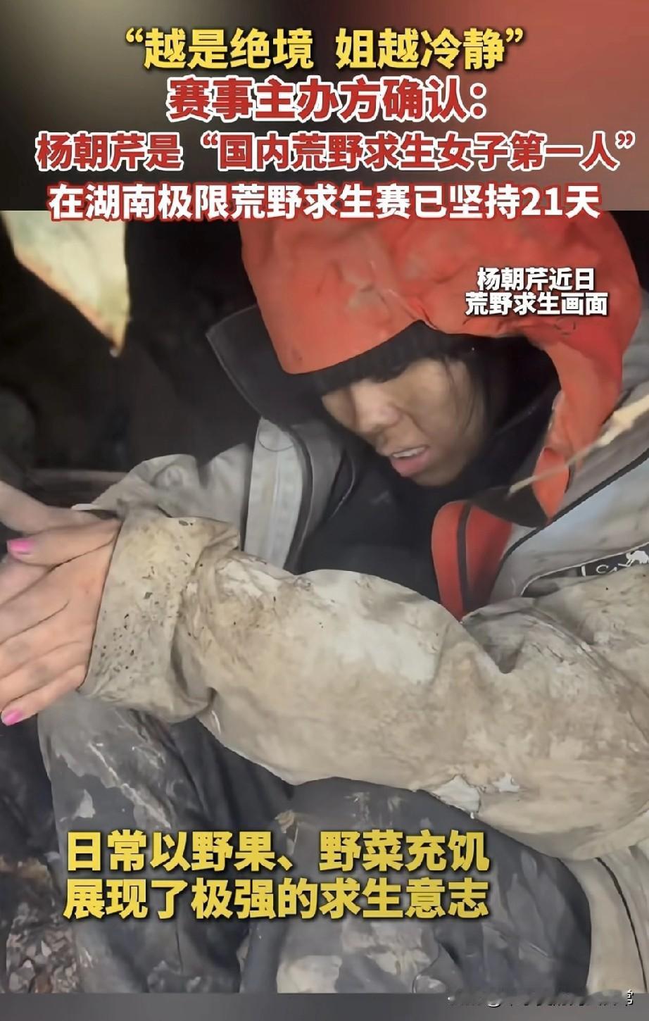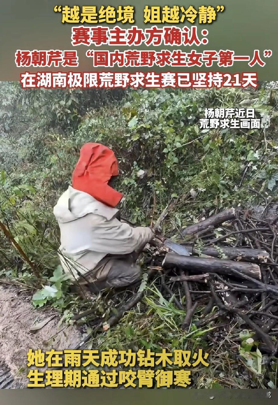 绝境姐杨朝芹火了!荒野求生21天! 这位“荒野女王”!杨朝芹在张家界极限荒野求生赛硬扛21天,雨天钻木取火绝了,生理期咬着手臂御寒,靠野果野菜续命,堪称“国内荒野求生女子第一人”! 有人狂赞她是真·女汉子,意志强到离谱;也有人质疑这是博眼球的“荒野作秀”。 你觉得这是硬核求生还是剧本套路?评论区来唠唠!