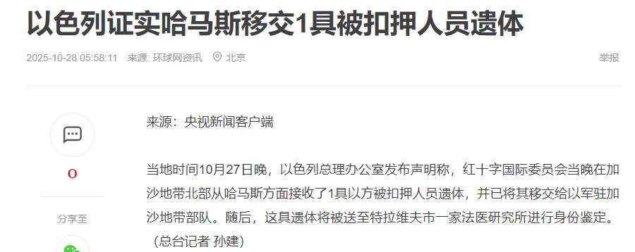 哈马斯大概是闯祸了。 以色列总理办公室证实:从加沙拿回的人质尸体,经过法医鉴定后证实,不是被绑架的人质,而是两年前一次军事行动的死者遗体,也就是说哈马斯骗了以色列人。 这事儿得从那纸停火协议说起,10月初的时候,美国牵头,埃及和卡塔尔在旁边帮着说和,好不容易把打得眼红的以色列和哈马斯摁到谈判桌前,签了第一阶段的停火协议。 条款写得明明白白,哈马斯得把去年10月7号绑走的人质,要么放活的回来,要么把死了的遗体交出来;以色列呢,就按“一具人质遗体换15具巴勒斯坦人遗体”的比例,释放巴勒斯坦囚犯,单说遗体这事儿,哈马斯就得交够28具,才算完成第一阶段的义务。 当时外界还挺乐观的,毕竟前几轮交换的时候,哈马斯确实交过3个活人质,以色列也放了183个巴勒斯坦囚犯,红十字会的车在边境来来回回跑,看着还挺像那么回事儿。 可没几天就不对劲儿了。活人质交了20个之后,就没下文了;说好的28具遗体,更是迟迟凑不齐。 一直到10月27号,哈马斯才通过红十字会交了4具遗体,以色列那边赶紧拿去鉴定,确认是去年被绑架的人质之后,马上就释放了600多个巴勒斯坦囚犯,本来以为这事儿能顺顺利利往下走,结果第二天哈马斯又送过来一具,法医一检查直接懵了,这具遗骸根本不是去年被绑的人,是两年前以色列军队行动的时候就已经死了的人,早就登记在案了! 以色列总理办公室当天就炸了锅,发公告说这是“明摆着违反协议”,内塔尼亚胡连夜把安全部门的头头们叫过来开紧急会,琢磨着怎么反击。最直接的招数就是卡脖子:本来都答应开放拉法口岸,让人道主义援助的卡车进去,这下直接无限期推迟了。 要知道加沙早就闹饥荒了,联合国8月份就说有50万人快饿死了,每天也就600辆卡车送物资,现在连这道口子都封了,老百姓更没法活了。 哈马斯那边倒还嘴硬,发言人哈泽姆·卡西姆出来辩解,说自己“一直在坚定履行协议”,已经交了18具遗体,剩下的实在挖不出来。理由听着好像有点道理:加沙被以色列的炸弹炸成一片废墟了,城市的建筑结构全毁了,谁也说不准遗体埋在哪儿,而且他们手里连重型挖掘设备都没有。 他还翻旧账,说加沙地下埋着一万个巴勒斯坦死者,以色列怎么不先让挖掘设备进来挖自己人呢?可这话根本站不住脚,要是真挖不着,大大方方跟调解方说一声就行,犯不着拿两年前的旧遗体来凑数啊,这操作简直是把“履约”当成过家家玩了。 更讽刺的是,这事儿刚好赶在美国张罗的“和平峰会”节骨眼上。特朗普本来想在埃及的沙姆沙伊赫当回“和平缔造者”,拉了20多个国家还有联合国来撑场面,还吹牛说“没有我,加沙的战争根本结束不了”。 结果现在停火协议先出了岔子,哈马斯早就放话不参加峰会,内塔尼亚胡也磨磨蹭蹭没答应去,这峰会还没开呢,就先露怯了。国际社会本来就担心这停火是“昙花一现”,法国外长早就说过“停火不代表能长久和平”,现在出了这档子事,更没人敢信哈马斯的诚意了。 其实从协议一开始,漏洞就不少。特朗普搞的这个方案,只硬逼着哈马斯交人质,却没提让以色列先给哈马斯挖掘设备,也没说要让援助物资跟上来。哈马斯手里没工具,挖遗体自然慢;以色列又卡着口岸不让物资进,加沙的民生越来越差,哈马斯就更没精力去履约,这不就成了死循环吗?但再难也不能搞“狸猫换太子”这一套啊,尤其是在人命关天的人质问题上耍小聪明,只会把仅存的那点信任全败光。 现在最尴尬的是中间帮忙调解的埃及和卡塔尔。他们本来天天在两边传话撮合,这下好了,两边都得罪不起。以色列放话要“采取进一步措施”,搞不好又要重启空袭;哈马斯要是真交不出剩下的13具遗体,这停火协议就得崩了。最倒霉的还是加沙的老百姓,刚冒着危险回到自己家,看到的全是废墟,现在援助又断了,都不知道这停火带来的这点好处还能享几天。 说到底,停火协议从来就不是块“遮羞布”,是给两边一个台阶下的机会。哈马斯要是真把老百姓的死活放在心上,就该老老实实跟调解方沟通,而不是靠造假蒙混过关;以色列也该明白,卡着援助不让进,解决不了人质问题,反而会让矛盾更激化。 要是这事儿最后闹到收不了场,特朗普吹的那“3000年和平机遇”,怕是要变成笑话了,加沙的战火搞不好又得烧起来。