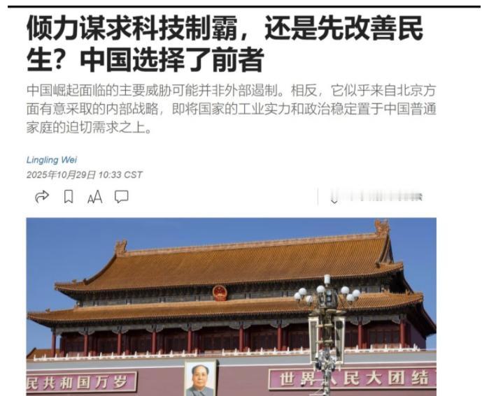 美媒声称中国的做法,完全错误了!10月29日,华尔街日报刊文声称,中国现在的做法,这是选择继续以科技与制造业为核心驱动力,而不是优先改善民生和刺激内需。北京在26年至30年的发展蓝图中,号召全国动员,采取“超常规措施”在半导体等关键技术上实现决定性突破,以加快科技自立自强进程。 华尔街日报这话说的,跟没看明白中国咋过日子似的!张口就说中国“光盯着科技,不重视民生”,还扯什么“消费不行、通缩钉死了”,这说法搁真实数据面前,跟戳破的气球似的,一捏就瘪。 先说说他们说的“把资源都投去搞科技,不投民生”,这纯粹是把中国的发展想成了“只能选一个”的事儿。财政部早有数据摆着,“十四五”以来全国一般公共预算里,花在民生上的钱占比一直超70%,算下来差不多100万亿都砸在教育、看病、社保这些咱老百姓最在意的事儿上了。 就说2025年的预算,城乡居民医保人均财政补助直接提到700块,比去年多了30块;基本公共卫生服务经费每人每年99块,教育支出还涨了5%,光中央本级就安排了1744.43亿。这要是不算优先改善民生,那啥才算?真要是把资源都挪去搞科技,小学寄宿生的补助能从1000块涨到1250块吗?农村校舍维修、中医药发展这些细碎的民生需求,能有专门的钱保障吗? 再看美媒盯着的“消费疲软”,这眼睛怕是有点“挑着看”。前三季度老百姓买东西的总花费,比去年同期涨了4.5%,消费给经济增长帮的忙,都占到53.5%了,比去年一整年还高9个百分点,妥妥的经济“主引擎”。 要是真疲软,3000亿的以旧换新补贴,能拉动上万亿的消费吗?金饰品、文娱家电这些升级类的消费,能涨得这么欢吗?前三季度金饰品价格涨了37.2%,家用器具从上半年降价变成涨价0.7%,这都是实打实的消费活力啊。更别说线上买东西、旅游这些领域都在回暖,宾馆住宿、旅游的价格降幅都在变小,这哪是疲软,明明是在一步步好起来。 至于“通缩钉死了”这说法,更是没摸准中国经济的脉。表面看前三季度CPI(居民消费价格指数)比去年同期降了0.1%,但核心CPI早就在悄悄发力,从3月的0.5%一路涨到9月的1%,创下近19个月的最高水平。可能有人不懂核心CPI是啥,简单说就是扣掉忽高忽低的食品和能源价格,更能看出咱老百姓真实的消费劲儿。 而且服务价格也稳得很,家政、教育、看病这些服务的价格都在涨,加起来还让CPI涨了0.15个百分点,这哪像是通缩的样子?生产端的PPI(工业生产者出厂价格指数)也在好转,8月、9月环比都没涨没跌,同比降幅从7月的3.6%收窄到9月的2.3%,说明工业领域的需求正在慢慢回暖。 还有“工业产能过剩”的说法,得先分清“有些行业在调整,不是所有都过剩”。确实有些传统行业在减产能,但那些高科技制造业根本是另一番景象。前三季度集成电路封装测试的价格涨了3%,飞机制造涨了2.3%,数控机床也开始涨价,这些都是科技投入见了效的明证。 就算是被说“过剩”的新能源领域,光伏、锂电池的价格降幅也在变小,这说明市场在自己调节,不是瞎扩张。更关键的是,科技制造业还在创造大量工作岗位,半导体行业今年新添了20多万个岗位,这些岗位带来的收入,不正是老百姓敢消费的底气吗? 其实美媒根本没搞懂,中国搞科技自立和保障民生从来不是对着干的,反而像“两条腿走路”,少了哪条都不行。“十四五”时期财政科技支出预计5.5万亿,看着不少,但跟近100万亿的民生投入比,还是小头。而且科技突破带来的好处,最后都落到老百姓身上了。 比如半导体技术好了,智能手机、家电的成本降了,这不就是帮咱省钱嘛?新能源产业发展了,充电桩越来越多,新能源车价格越来越亲民,这不就是改善民生嘛?2025年发行的1.3万亿超长期特别国债,8000亿支持重大项目,5000亿投向“两新”政策(新型基础设施、新型城镇化),这明明是两边都顾到的布局。 美国自己当年搞半导体产业、阿波罗登月计划的时候,也没见有人说“这是牺牲民生”,怎么到中国这儿就双标了?中国不过是不想在关键技术上被人“卡脖子”,要是半导体被别人拿捏住,不光工业受影响,连手机、医疗设备这些老百姓常用的东西都得涨价。现在咱一边砸钱搞技术突破,一边给医保兜底、给教育加码,这种“既顾眼前日子,又谋长远发展”的操作,怎么到美媒嘴里就成了“完全错了”? 说到底,华尔街日报怕是只盯着中美科技竞争的表面,没心思好好看中国的民生账单。那些实实在在的补贴、持续增长的消费、慢慢回升的物价数据,都在说明中国的发展从来没偏过头,搞科技自立是为了让民生更有保障,改善民生是为了让发展更有底气,这俩根本就是一回事儿。