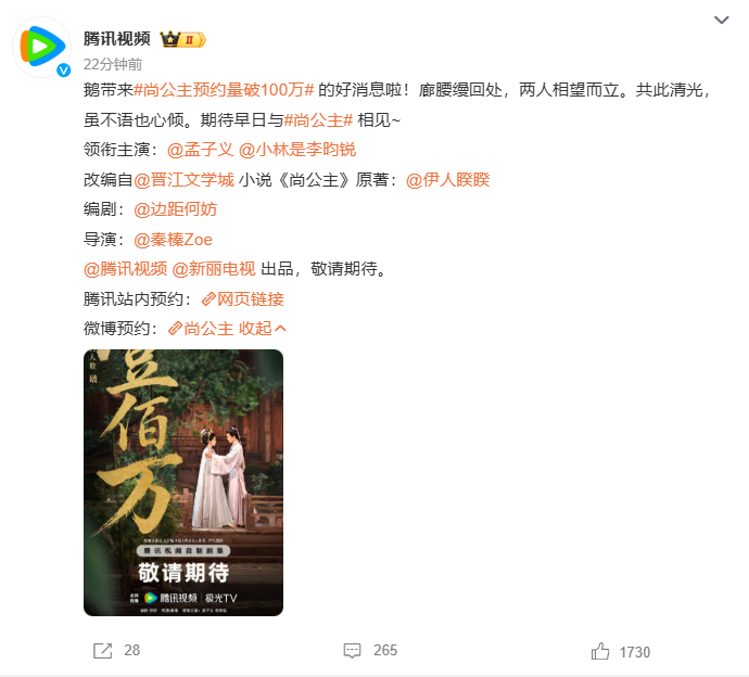 《尚公主》预约量表现出色,其双人海报也营造出十足氛围,孟子义与李昀锐以张相望而立的姿态呈现在海报中,为作品铺垫了良好的前期热度。尚公主预约破100万双人海报孟子义李昀锐张相望而立海报