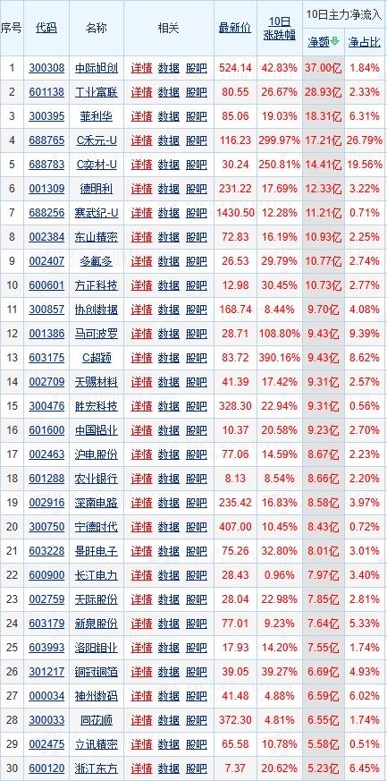 午盘上证指数4003-4025点之间震荡,个股分化,高低轮动行情,能源金属,电池类走强。 留意;今天资金净流入,10日资金净流入前30名。