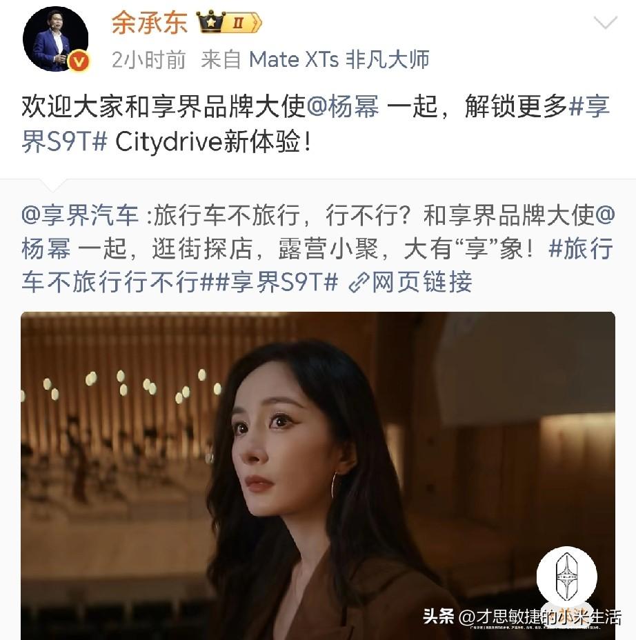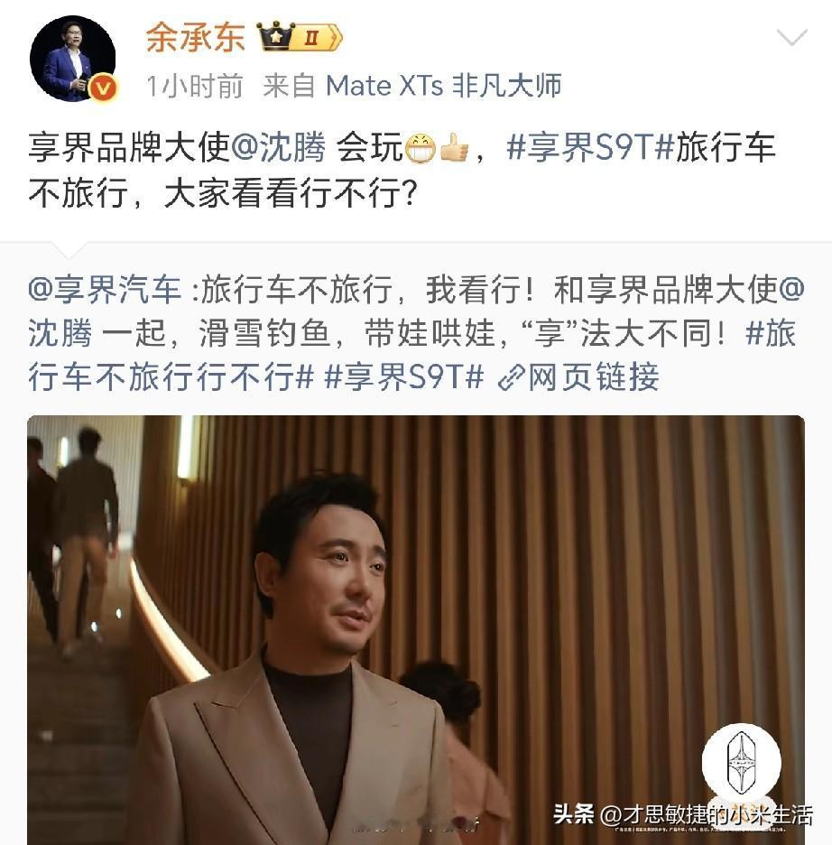 余承东放大招了,一口气官宣了两位享界品牌大使!沈腾和杨幂! 称自己不会营销的理工男余总,这不请来了两位品牌大使! 余总说自己不会营销,太谦虚了,余总自带流量,话题和流量绝对不会输给上面两位大使! 余总的话题不断,频繁爆出新的话题和经典语录!“漂移到绿化带上”,“玩漂移是愚蠢行为”。 余总为享界S9T旅行车拍摄的宣传大片很出彩,享界S9T旅行车在余总的带领下成了爆款,把旅行车从小众走向潮流。 余总说享界S9T非常火爆!鸿蒙智行旗舰9系,新款享界S9 11月上市! 11月马上就要来了哦,超期待鸿蒙智行旗舰9系新车! 你们觉得呢?