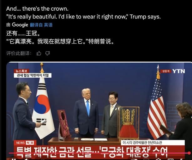 不得不说,在进贡这一块业务上,韩国确实是相当可以的。 昨天一击即中,送了老特一顶王冠。据说,这个金色王冠模型的原型是出土于韩国庆州的新罗王朝金色王冠。老特顿时就沦陷了,被金光闪闪的权力高兴得合不拢嘴,放话想立即戴上它! 不过这顶金冠看着光鲜,背后却是韩国实打实的 “割肉换和平”。老特笑纳礼物后,直接敲定韩美贸易协议,韩国掏 3500 亿美元对美投资,才换来了汽车关税从 25% 降到 15% 的 “优惠”。这哪是外交送礼,分明是用国宝当敲门砖,给美国送真金白银! 也不怪老特如此爱不释手,这顶王冠的来头可不小,不是普通的镀金玩具!原型是公元 4 到 6 世纪新罗王国的天马冢金冠,是他们的国宝级文物,象征着古代国王的权力和威严。 为了讨好特朗普,他们直接做了个一模一样的复制品,代表天命与王权结合,彰显老特这个领袖的强大权威。简直美到了老特心坎里,他向来喜欢摆帝王派头,白宫都装修得金碧辉煌,小韩这波投其所好,精准拿捏了! 更夸张的是,为了将 “金色主题” 贯彻到底,他们真是煞费苦心!李在明的金色领带,午餐特意准备的金箔点缀的甜点,连欢迎仪式上都演奏他竞选时的专用曲目《YMCA》,21 响礼炮、无穷花大勋章轮番上阵,把 “讨好” 二字刻进了每一个细节。 要知道,无穷花大勋章是韩国最高荣誉,这还是第一个获此殊荣的美国总统,待遇直接拉满! 可算盘打得再响,也架不住美国的贪婪!小韩掏心掏肺送厚礼,换来的却是不平等协议:3500 亿美元里,2000 亿是现金投资,1500 亿要砸进美造船业,每年最多投 200 亿,而且主导权在美国手里,赚了归美韩共有,亏了就全算韩国自己的。 这种“收益共享、风险独担”的操作,国内早已经骂翻了天!民众上街抗议,高呼 “不要国王”“拒绝屈膝讨好”,毕竟这 3500 亿是老百姓的血汗钱,原本能用来改善民生、发展产业,现在却要白白送给美国,帮人家创造就业,自己只能承担风险,换谁都不乐意! 但这也是没办法的无奈之举。经济上,我国是他们最大贸易伙伴,半导体、汽车都离不开中国市场;安全上,又得靠美国驻军撑腰。一边不敢得罪中国,一边又得讨好美国,夹在中间只能靠 “送礼外交” 找平衡,用一顶金王冠换暂时的安稳,说穿了就是小国在大国夹缝中的生存心酸。 可老特压根不吃 “人情账” 那一套,收礼时笑得开心,要好处时一点不含糊。之前韩企工程师在美国被当犯人一样上手铐逮捕,尊严都被踩在脚下,现在送了王冠,该敲的竹杠还是照敲不误。说明国际交往从来都是实力说话,靠讨好送礼换不来真正的尊重,只会让人觉得你好拿捏。 其实他们心里也清楚,这 3500 亿可能会带来 “灾难性影响”,但在重压下,只能硬着头皮答应,这份无奈,恐怕只有他们自己知道。 送王冠看似风光,实则是把尊严放在地上摩擦,最后还未必能换来想要的结果。大家觉得这顶金王冠送得值吗?3500 亿换关税优惠,到底是明智还是妥协? (每天更新,欢迎关注,喜欢文章的可以帮忙点个赞留条评~) 对此大家有什么看法?