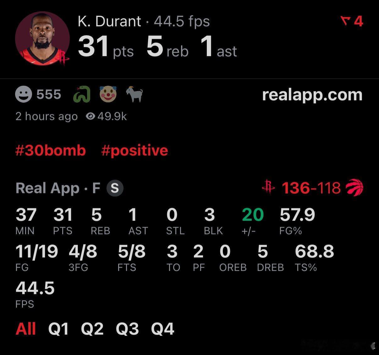 杜兰特末节收割比赛!拿到全场最高的31分!火箭生涯第二次30+🚀
