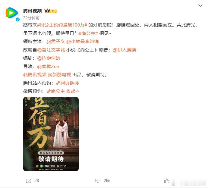 《尚公主》预约表现突出,其双人海报也颇具特色氛围,孟子义与李昀锐以张相望而立的造型呈现在海报中,引发观众对作品更多的期待。尚公主预约破100万双人海报孟子义李昀锐张相望而立海报
