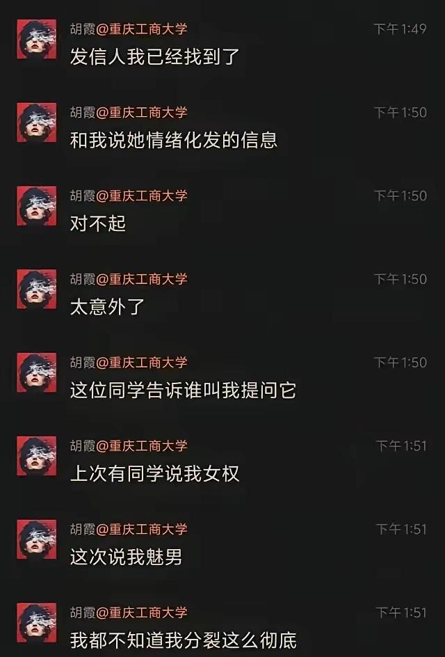 这个女生的情绪化需要自己买单,别以为到了社会谁都要迁就她。你可以说她女权,你也可以说她媚男,你说她又女权又媚男那确实有点精神分裂。如果是男老师,会有怎么样的结果,很显而易见啊。惹上事了就说自己有精神病,开始给自己套Buff,现在的人玩的都很溜呀。动不动就说老师不尊重他们,说实话他们有几个尊重过老师,大学生太多了,什么人都能上大学,把学校风气搞歪了!