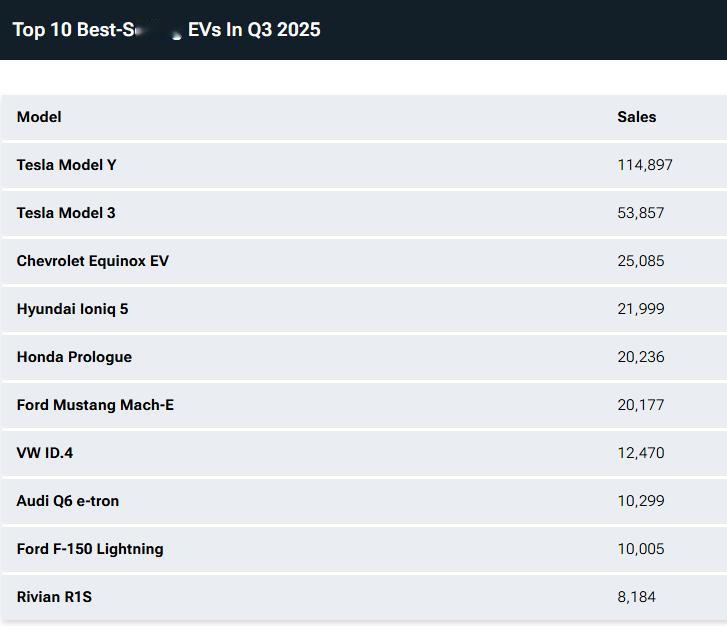 【美国电动汽车销量创历史新高,特斯拉稳居第一,奥迪意外跻身前列】 今年第三季度美国电动汽车销量达 43 万 8487 辆,创下季度销量历史最高纪录;按车型划分,特斯拉 “Model Y” 仍稳居销量榜首。 Model Y 销量较去年增长 29%,但特斯拉整体市场份额从 49% 降至 41%。Model 3 同样以 5 万 3857 辆的销量保持第二,不过较去年同期下降 7.8%。 排名第三的是雪佛兰探界者 EV(Equinox EV),销量达 2 万 5085 辆,较去年同期增长 156.7%,展现出惊人的增长势头。 第四名为现代汽车 “艾尼氪 5(Ioniq 5)”,销量 2 万 1999 辆;本田 “Prologue”(2 万 236 辆)、福特 “Mustang Mach-E”(2 万 177 辆)等紧随其后。 最令人意外的结果是奥迪 “Q6 e-tron” 跻身销量前列。尽管属于豪华车型,但其销量仍达 1 万 299 辆,超过了热门车型福特 F-150 Lightning(1 万 5 辆)。 此外,Rivian R1S(8184 辆)、雪佛兰 Blazer EV(8089 辆)、起亚 EV9(7510 辆)、凯迪拉克 Lyriq(7309 辆)等车型也表现不俗。 从今年年初至今,美国电动汽车总销量已突破 104 万辆,较去年同期增长 11.7%。 按品牌划分,特斯拉销量为 45 万 1160 辆,虽较去年同期下降 4.3%,但仍稳居第一;雪佛兰以 8 万 7137 辆的销量激增 113%,位列第二;第三名为销量 6 万 9600 辆的福特,第四名为销量 5 万 7167 辆的现代汽车。 另一方面,专家预测,受美国联邦电动汽车税收抵免政策取消影响,下半年起电动汽车销售增长势头可能会有所放缓。【来自懂车帝车友圈】