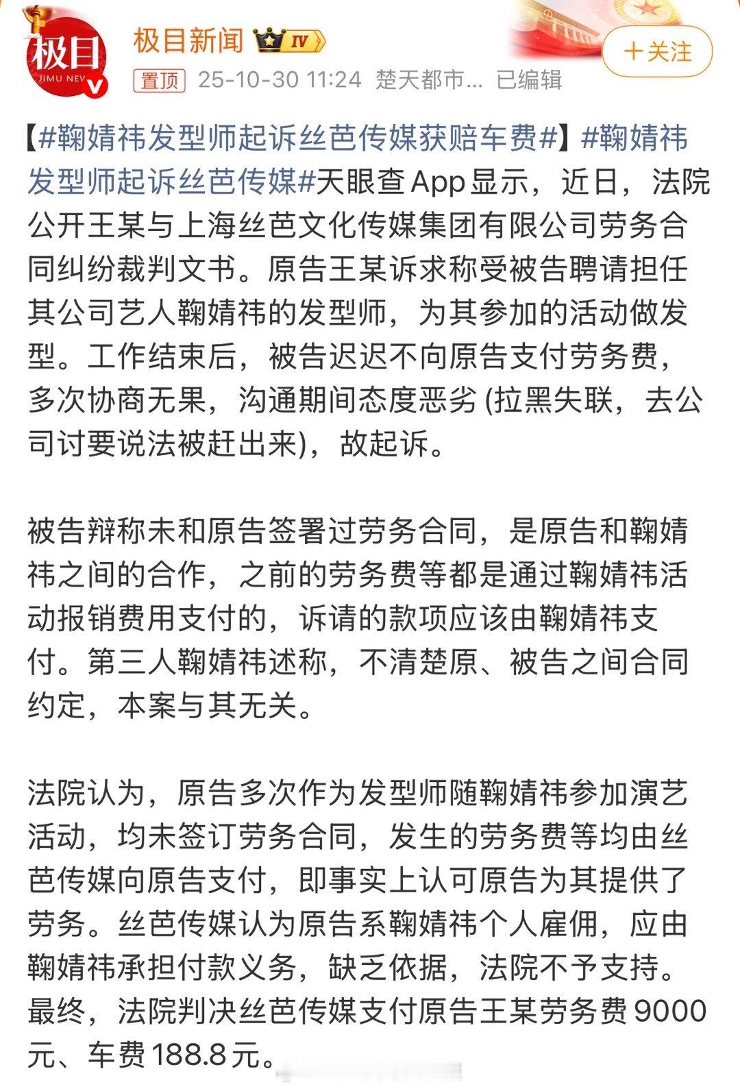 鞠婧祎发型师起诉丝芭传媒,称工作结束后,丝芭迟迟不支付劳务费,多次协商无果,去公司讨要说法还被赶出来……