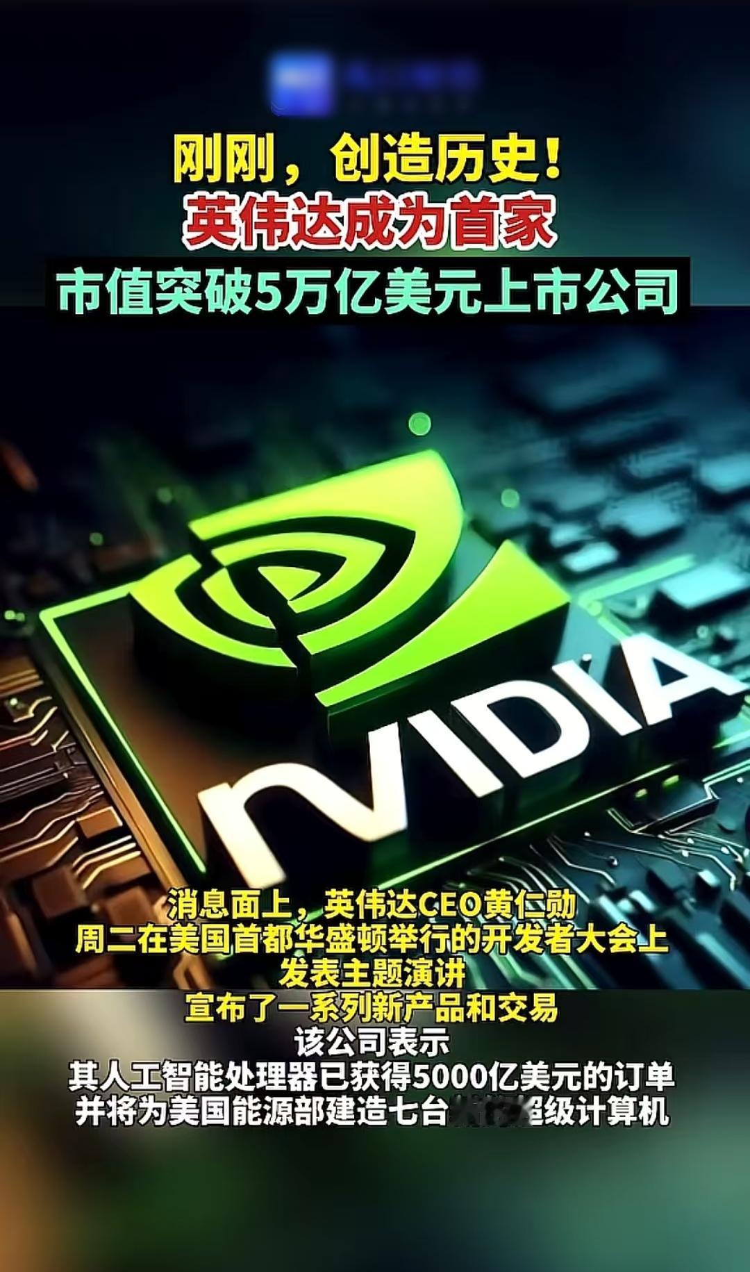 人比人气死人! 英伟达这家科技公司的市值冲破了5万亿美元! 我们的科技公司,不是在研究普通人的饭碗,就是 在思考怎么研究无人设备,优化更多的岗位! 别人的科技公司在研究核心技术烧钱,我们在团购大战上补贴烧钱! 5万亿的市值,意味着什么? 就是一个英伟达公司,相当于是三分之一的A股市值! 超过英国、法国、德国等主要国家股市的总市值! 国内的科技公司,不要再卷老百姓的口袋了!