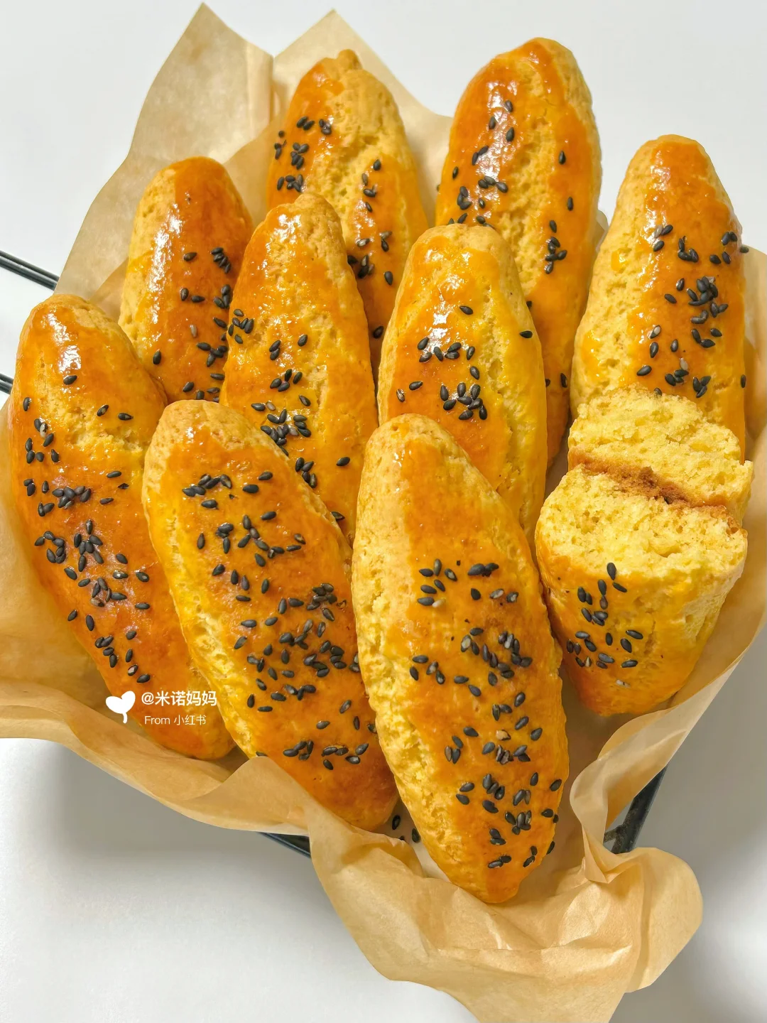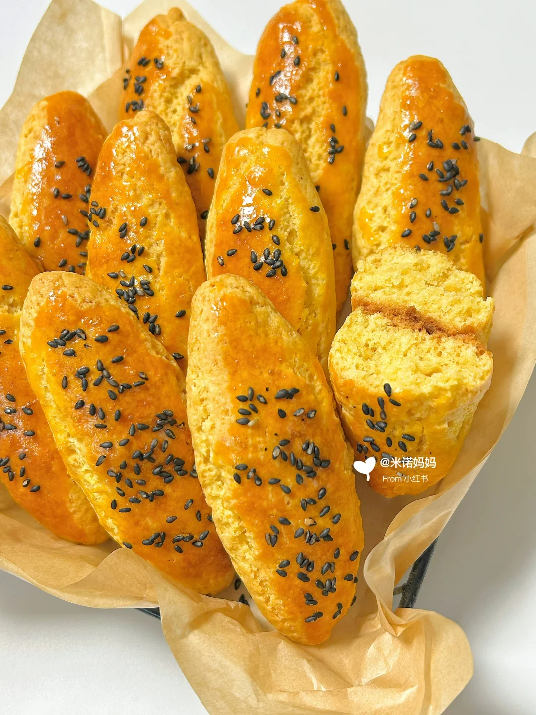 玉米面粉80g | 低筋面粉120g | 牛奶45g | 玉米油30g | 🥚蛋1个 | 糖 30g | 泡打粉4g | 蛋黄液1个(刷表面用) | 黑芝麻适量